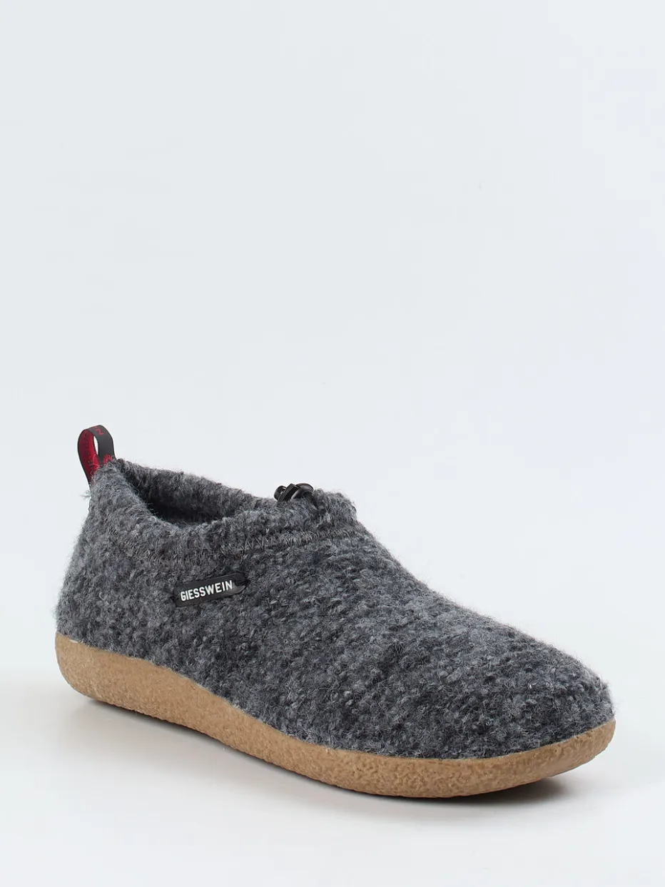 Alpiner Charme, modern interpretiert.Giesswein bietet mit diesem Hüttenschuh ein wärmendes Komforthighlight für entspannte Momente. Für kühle Böden und gemütliche Abende konzipiert, überzeugt das Modell durch atmungsaktiven Wollfilz mit melierter Oberfläche. Die runde, kompakte Form in Anthrazit trifft auf funktionale Details wie den elastischen Kordelzug, eine rote Fersenlasche und das seitlich gesetzte Marken-Label. Die rutschhemmende Naturkautschuksohle ist alltagstauglich und stabilisierend. Inspirieren lässt sich das Design von alpinem Minimalismus mit Cottagecore-Flair. Ideal kombinierbar mit warmem Loungewear oder Wollsocken. Ein durchdachtes Wohlfühlprodukt mit Fokus auf Qualität, Funktion und Stiltypik der Marke.