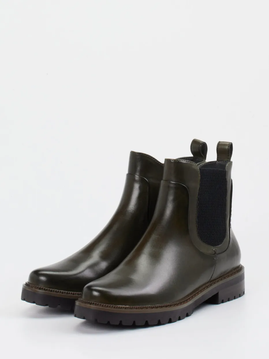 Robuster Stil für kühle Tage.Ginger & Glove interpretiert den Chelsea Boot als moderne Damen-Stiefelette mit klarem Design. Ideal für wechselhafte Herbsttage im Alltag oder im Büro vereint dieser knöchelhohe Schuh minimalistischen Stil mit hohem Tragekomfort. Das fein glänzende Lammleder in Dunkelolivgrün wird durch einen seitlichen Elastikeinsatz und einen verdeckten Reißverschluss ergänzt. Eine profilierte Gummisohle sorgt für Trittsicherheit bei jedem Wetter. Die Ton-in-Ton-Nähte und Zuglasche unterstützen die klare Linienführung. Besonders passend zu Wollmantel oder Strickkleid für entspannte City-Looks. Markentypisch souverän und urban durchdacht.