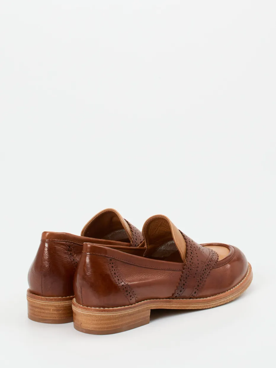 Stilvoller Akzent für klassische Looks.Ginger & Glove zeigt bei diesem Damenloafer aus der Kategorie Halbschuhe eine ansprechende Verbindung aus Eleganz und Komfort. Das Modell aus hochwertigem Lammleder besticht durch seine glänzende Oberfläche und eine harmonische Zweifarbigkeit mit mittelbraunem Grundton und beigem Blatt. Feine Brogue-Lochungen und dekorative Ziernähte akzentuieren die stilvolle Silhouette. Die flache Form und schlupffreundliche Verarbeitung sorgen für hohen Tragekomfort, während der Rahmen in Holzoptik einen dezenten Kontrast bietet. Als Ausdruck des „Quiet Luxury“-Trends verbindet dieser Schuh britisch inspirierte Heritage-Ästhetik mit alltagstauglicher Leichtigkeit. Ein femininer Begleiter mit klassischem Chic und handwerklichem Anspruch.