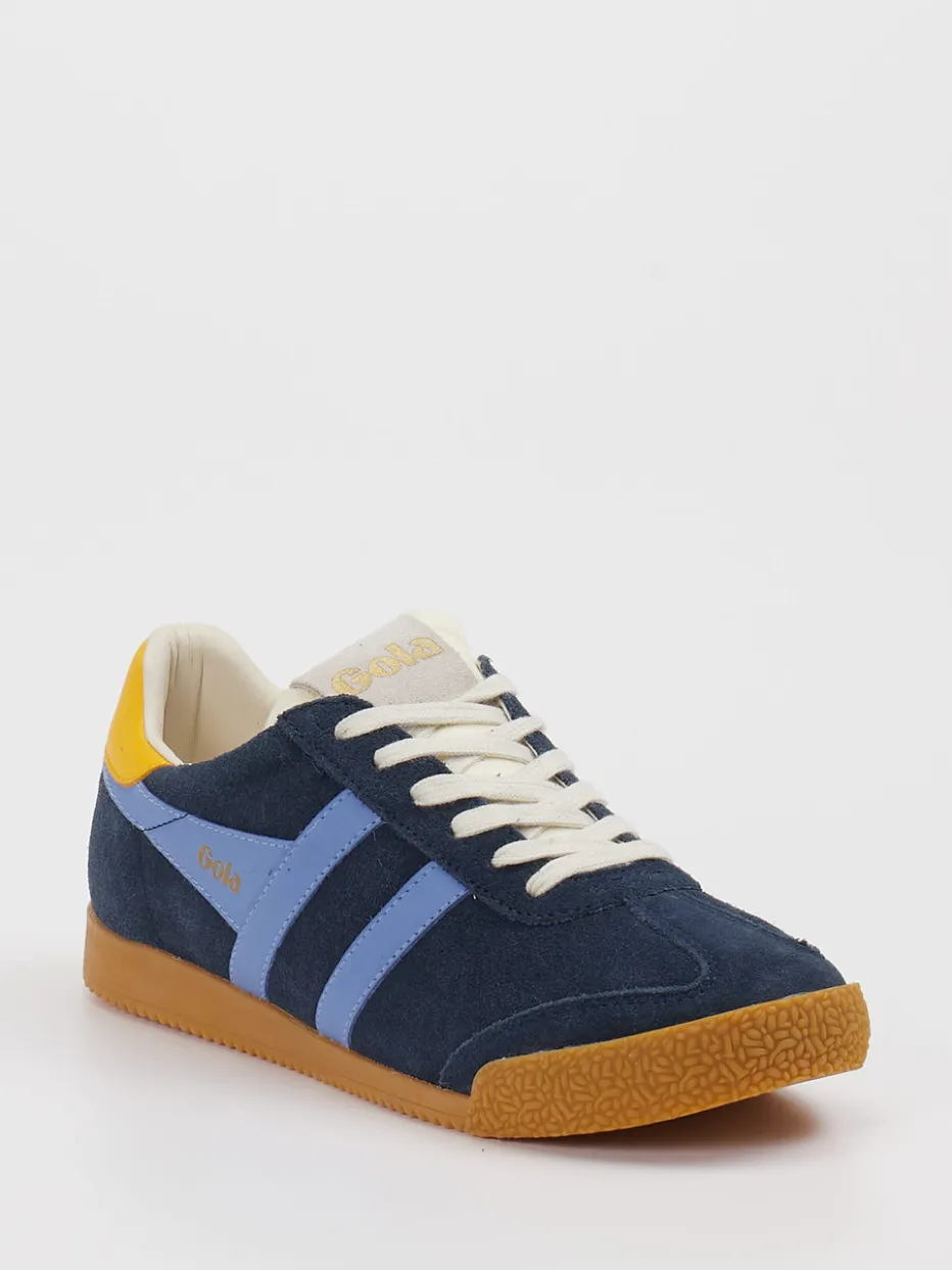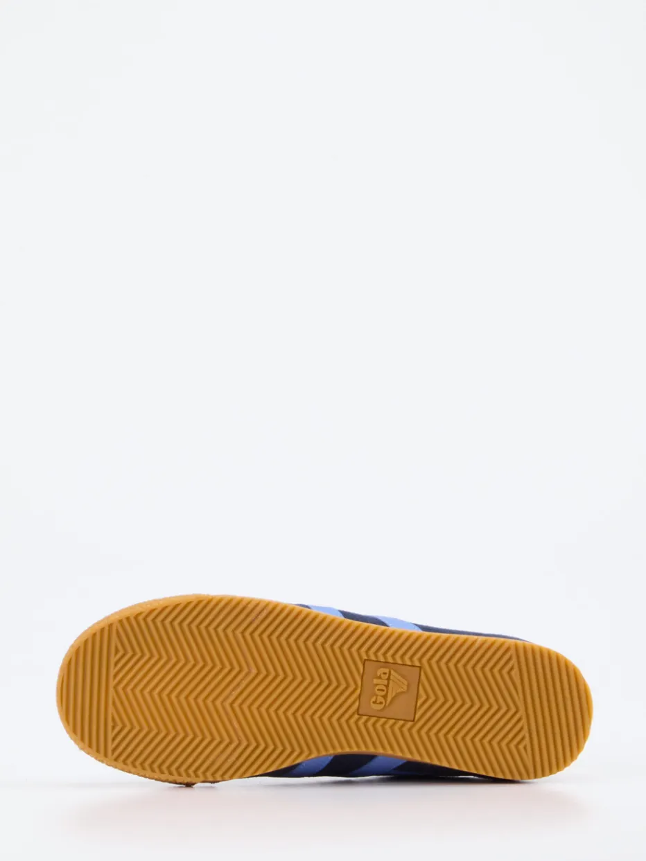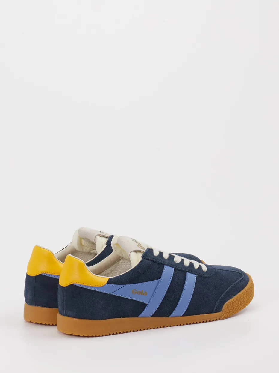 Retro trifft Streetstyle. Gola präsentiert einen unisex Retro-Sneaker mit flacher Silhouette für einen trendorientierten Alltag. Ideal für entspannte Stunden in der Stadt: Der Sneaker aus weichem Veloursleder zeigt sich in sattem Dunkelblau mit hellblauen Seitenstreifen und auffälligem Fersendetail in Gelb. Die strukturierte Gummisohle sorgt für Stabilität und fügt einen Vintage-Touch hinzu, während Textilfutter und geschnürter Verschluss Komfort bieten. Die geprägten Fischgrät-Details an der Sohle ergänzen das stimmige Design. Ein Modell, das stilistisch stark im Streetwear-Trend der kommenden Saison SS25 verankert ist und sich hervorragend zu lässigen Jeans oder monochromen Sets kombinieren lässt. Ein individueller Sneaker mit markentypischem Retro-Charakter und komfortabler Alltagstauglichkeit.
