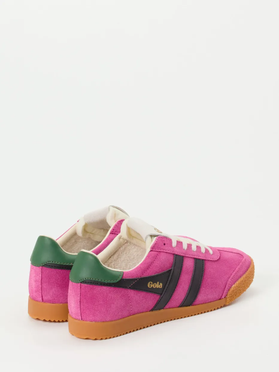 Statement-Sneaker mit Retro-Charme. Mit dem Modell Elan bringt Gola einen Retro-Sneaker für Damen, der vielfältig kombinierbar und stilprägend zugleich ist. Ideal für expressive Freizeit-Styles: Der Elan-Sneaker verbindet hochwertiges Veloursleder in kräftigem Pink mit markanten schwarzen Seitenstreifen und einem waldgrünen Fersen-Patch. Die flache, schmal zulaufende Silhouette, goldfarbene Logoakzente und die orangefarbene rutschfeste Gummisohle setzen starke stilistische Akzente. Schnürung und Innenfutter aus Leder und Frottee garantieren funktionalen Komfort, während der Look stark von Vintage- und Streetwear-Einflüssen geprägt ist. Lässt sich bestens zu Track Pants oder schlichten Basics kombinieren. Ein farbenfrohes Key-Piece für modebewusste Looks mit Gola-typischem Heritage-Flair.