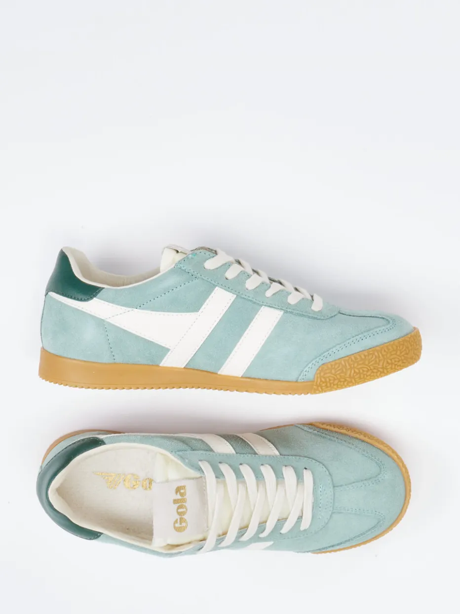 Dieser Retro-Sneaker von Gola überzeugt mit salbeigrünem Veloursleder, goldfarbenem Branding und klarer Vintage-Silhouette – ein Highlight für moderne Streetwear-Looks.