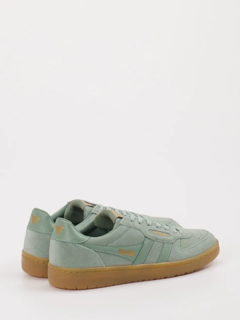 Vintage trifft sanfte Moderne. Gola präsentiert diesen Retro-inspirierten Sneaker für Damen und Herren. Ideal für entspannte Alltagsmomente vereint der Schuh hochwertiges Veloursleder mit matter Oberfläche und strukturgebender Perforation im Zehenbereich. Die trendige Farbe Salbeigrün trifft auf eine kontrastierende Gummisohle in Hellbraun, während goldfarbene Logodetails auf der Zunge und Ferse dezente Highlights setzen. Mit gepolstertem Schaftrand und flacher Form liegt der Fokus auf Komfort und klassischer Ästhetik. Der Look harmoniert besonders mit naturtönen Crossbody-Bags oder Canvas-Caps. Charakteristische 90s-Silhouette mit modernem Farbton – typisch Gola.