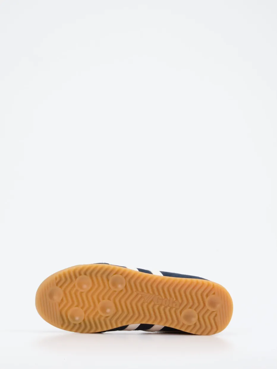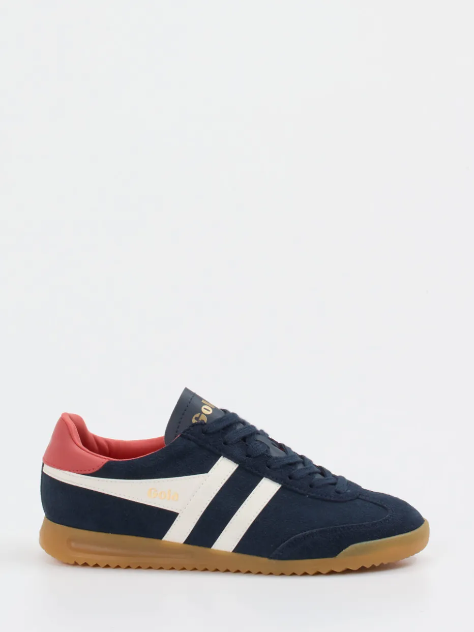Streetstyle trifft 90s-Retro-Flair.Gola präsentiert mit seinem Unisex-Sneaker einen sportlich-eleganten Retro-Runner für den Alltag. In urbanem Dunkelblau und mit kontrastierenden Streifen in Cremeweiß sowie einem ziegelroten Fersenbesatz macht dieser Sneaker optisch wie stilistisch Eindruck. Veloursleder mit matter Oberfläche sorgt für eine samtige Haptik, während das atmungsaktive Textilfutter bequemen Tragekomfort bietet. Die flach zulaufende Silhouette, die profilierte Gummisohle und ein goldfarbener Logo-Print runden das Design ab. Inspiriert von der Vintage-Ästhetik der 90er, passt dieses Modell perfekt zu Streetwear-Outfits und sportiven Styles. Ein Sneaker mit Stil und Funktion – typisch Gola.