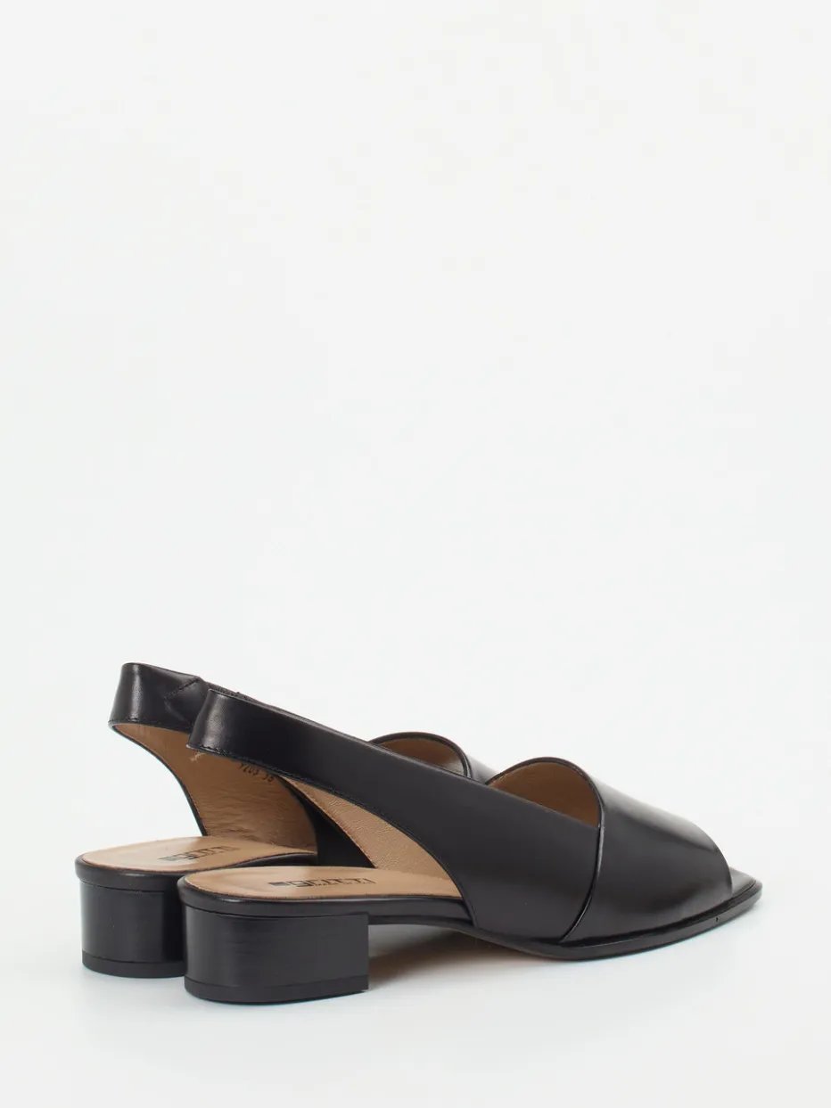 Unkompliziert ist dieser Slingpumps aus schwarzem Kalbleder der Marke Gritti. Puristisch in der Linienführung wirkt der durch das schöne Material. Die Carréform auf dem kleinen, blockigen Absatz hat eine besonders angenehme Passform. Die vordere Bandage bietet einen guten Halt und das Fersenriemchen passt sich in der Länge durch den kleinen, elastischen Ledereinsatz individuell an. Besonders angenehm ist die leichte Innenpolsterung.