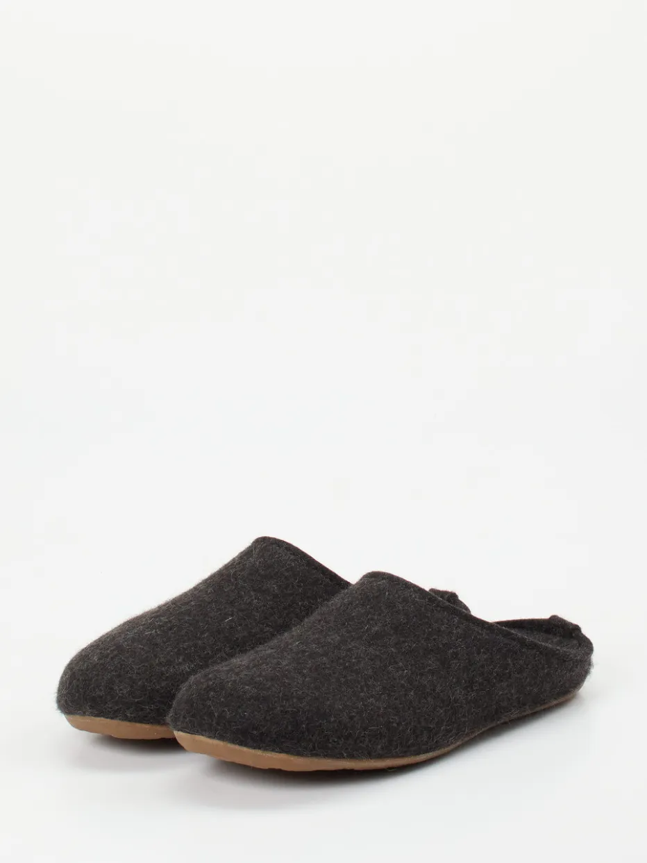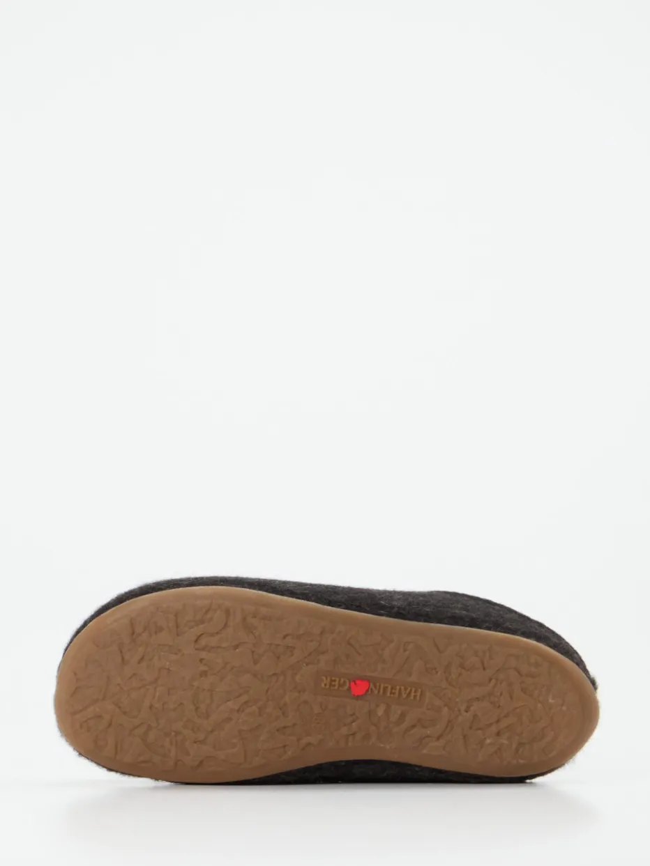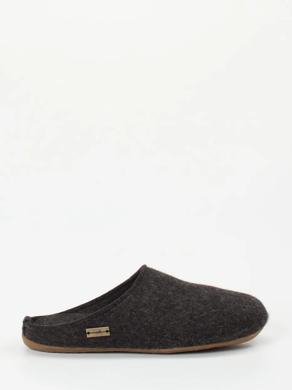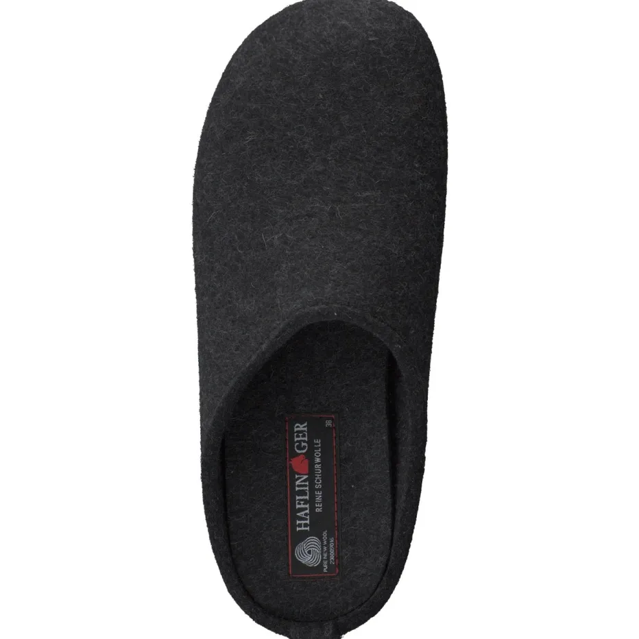 Natürlich komfortabel durch den Winter.Haflinger präsentiert mit diesem Unisex-Hausschuh eine gemütliche Filzpantoffel für entspannte Wohnmomente. Ob an kalten Morgen oder langen Abenden: Der Slip-on aus reiner, filzig-texturierter Schurwolle in dunklem Anthrazit bietet ein warmes, atmungsaktives Fußklima. Die offene Fersenpartie erleichtert den Einstieg, während das mit weicher Wolle bezogene Korkfußbett ergonomisch unterstützt. Rutschhemmendes Gummi sorgt für sicheren Stand auf glatten Böden. Minimalistisch im Design mit dezentem Metall-Label verbindet das Modell alpine Bodenständigkeit mit modernem Slow Living. Ein langlebiger Wohlfühlklassiker mit funktionalem Komfort – typisch Haflinger.