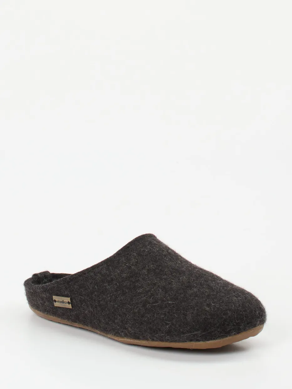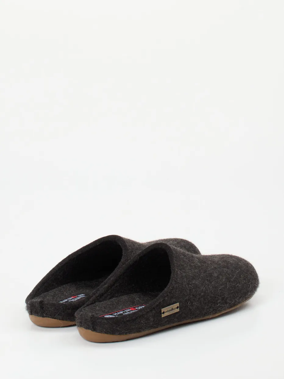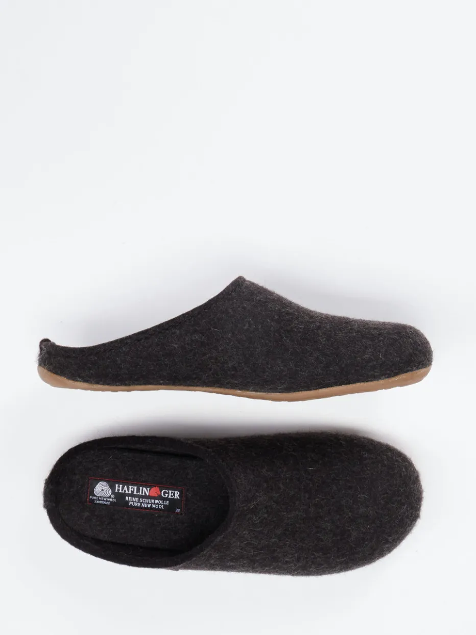 Natürlich komfortabel durch den Winter.Haflinger präsentiert mit diesem Unisex-Hausschuh eine gemütliche Filzpantoffel für entspannte Wohnmomente. Ob an kalten Morgen oder langen Abenden: Der Slip-on aus reiner, filzig-texturierter Schurwolle in dunklem Anthrazit bietet ein warmes, atmungsaktives Fußklima. Die offene Fersenpartie erleichtert den Einstieg, während das mit weicher Wolle bezogene Korkfußbett ergonomisch unterstützt. Rutschhemmendes Gummi sorgt für sicheren Stand auf glatten Böden. Minimalistisch im Design mit dezentem Metall-Label verbindet das Modell alpine Bodenständigkeit mit modernem Slow Living. Ein langlebiger Wohlfühlklassiker mit funktionalem Komfort – typisch Haflinger.