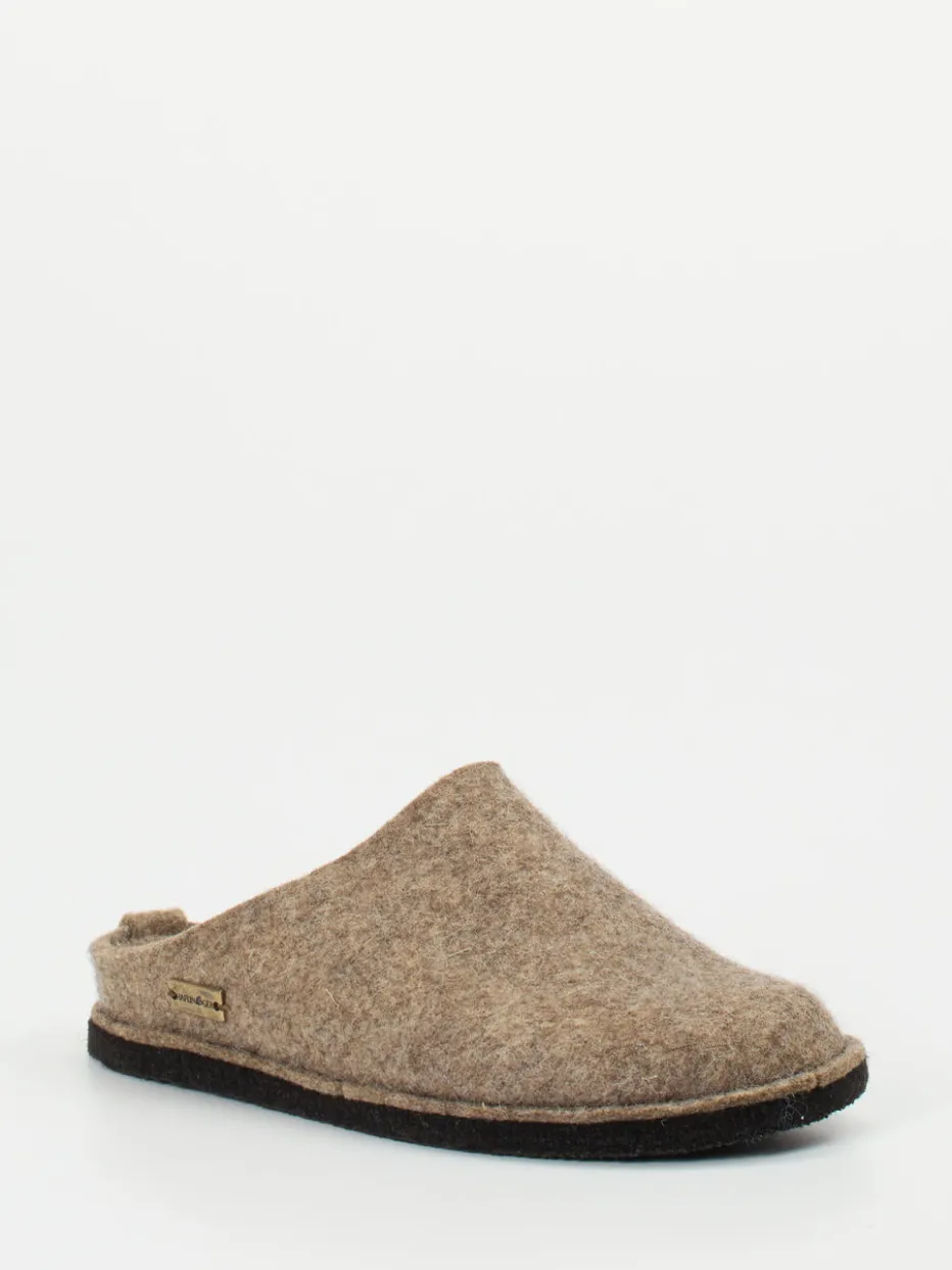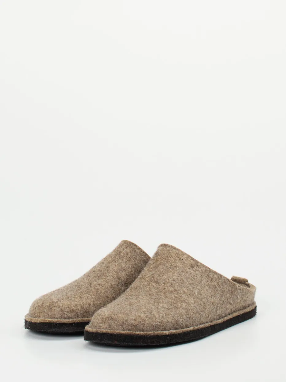 Wärme trifft Klarheit.Haflinger bietet mit dieser Unisex-Filzpantoffel ein wohltuendes Schuhwerk für entspannte Stunden zuhause. Ideal für kühle Böden oder ruhige Abende: Der Hausschuh aus reiner, filziger Schurwolle kombiniert ein angenehm warmes Tragegefühl mit atmungsaktiver Funktionalität. Seine mittelbraune Farbgebung im hellen Schlammton unterstreicht die minimalistische Clog-Silhouette. Der offene Fersenbereich mit hochgezogenem Rand ermöglicht leichtes Hineinschlüpfen und sichert stabilen Halt. Die schwarze Latex-Gummisohle schützt rutschhemmend auf glatten Untergründen. Inspiriert vom skandinavischen Komfortstil, fügt sich das Design in den Trend Natural Materials FW24 ein und passt ideal zu loungetauglichen Textilien. Komfort, Nachhaltigkeit und Formklarheit – typisch Haflinger.