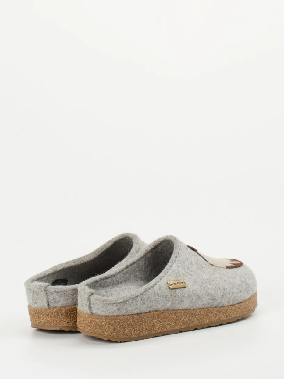 Wärme trifft Natürlichkeit.Der Hausschuh von Haflinger bietet gemütliche Wärme für zuhause oder das Wochenende in den Bergen. Hergestellt aus hellgrauer, filziger Schurwolle, hält der geschlossene Pantoffel angenehm warm, ohne zu überhitzen. Das ergonomisch geformte Kork-Latex-Fußbett bietet Halt und Komfort, während die mit Gummibesatz profilierte Sohle zuverlässigen Grip sichert. Punktuell akzentuiert mit Tiermotiv-Applikation und seitlichem Markenbadge in Metalloptik, unterstützt das Modell den Cottagecore-Trend. Ideal kombinierbar mit Loungewear oder dicken Wollsocken. Natürlich wärmend mit alpiner Seele – Haflinger-Komfort für jeden Tag.