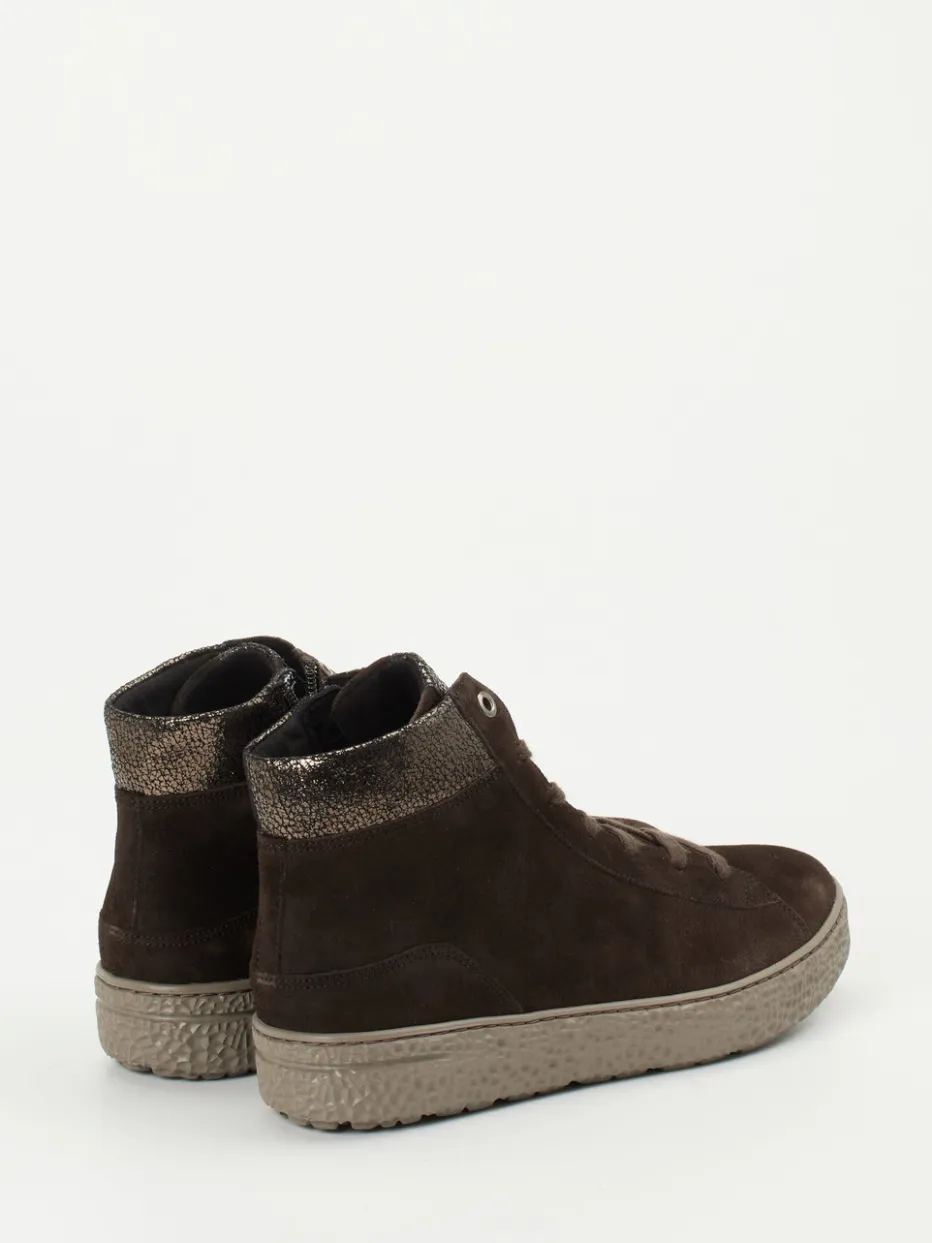 Metallic trifft Komfort. Hartjes präsentiert mit diesem High-Top-Sneaker eine stilvolle Ergänzung für entspannte Herbsttage. Ob beim Stadtbummel oder dem täglichen Weg zur Arbeit – das weiche Veloursleder in dunklem Braun, kombiniert mit subtilem Metallic-Finish an Zunge und Schaft, sorgt für einen modischen Auftritt mit Charakter. Die knöchelhohe Form bietet angenehmen Halt, während Schnürung und seitlicher Reißverschluss ein unkompliziertes An- und Ausziehen ermöglichen. Eine strukturierte Gummisohle gewährleistet Rutschfestigkeit, und dank herausnehmbarem Kork-Filz-Fußbett eignet sich das Modell auch für eigene Einlagen. Stilistisch inspiriert sich der Schuh an urbaner Streetwear mit casual Anspruch. Ein komfortbewusster Alltags-Allrounder mit liebevollen Details – typisch Hartjes.