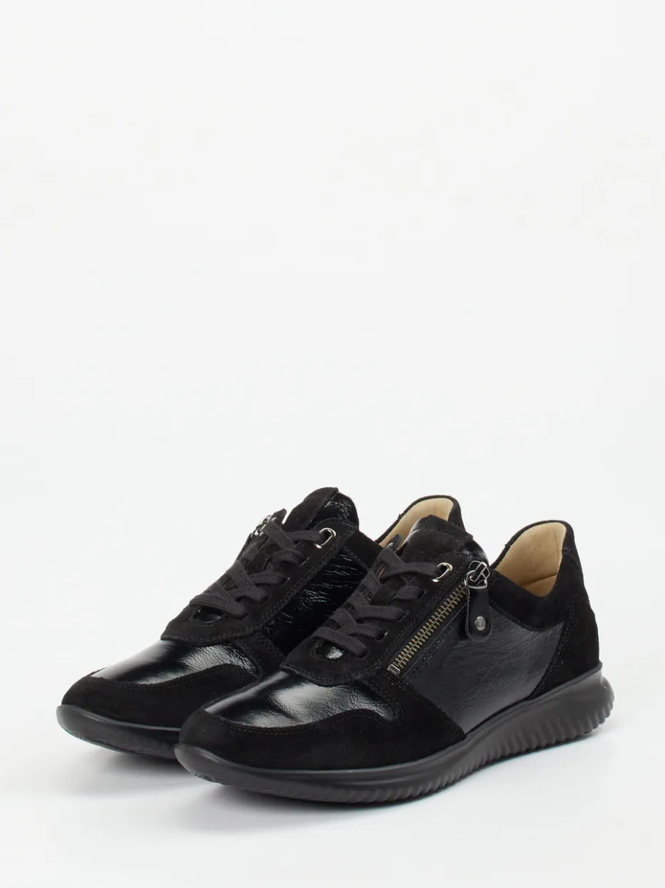 Modernes Understatement für jeden Tag.Hartjes präsentiert einen Komfort-Sneaker für Damen mit Fokus auf Alltagstauglichkeit und Stil. Schwarzes Lackleder wird durch mattes Veloursleder akzentuiert – ein mix aus glänzenden und zurückhaltenden Texturen, harmonisch kombiniert in einem sportlich-flachen Schnitt. Ein seitlicher Reißverschluss ergänzt die Schnürung und erleichtert das Anziehen. Die profilierte Gummisohle mit Markenprägung sorgt für sicheren Tritt im Büro und in der Freizeit. Dezente Ton-in-Ton-Nähte unterstreichen den minimalistischen Look, inspiriert vom Trend „Quiet Luxury“. Besonders stimmig zu schmalen Jeans oder monochromen Office-Outfits. Typisch Hartjes: maximaler Komfort trifft durchdachtes Design – made for everyday elegance.
