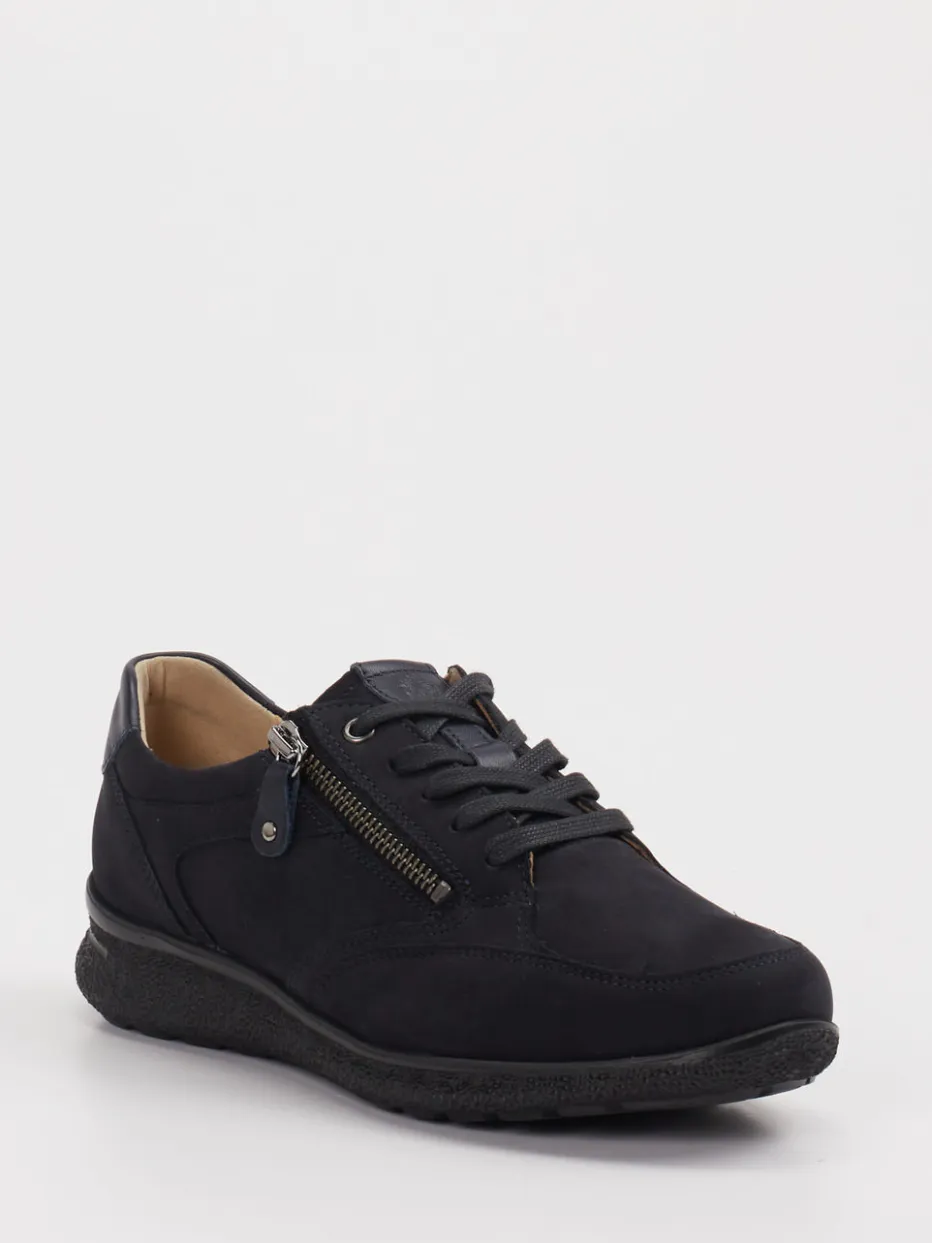 Komfort trifft dezente Eleganz.Hartjes präsentiert einen Damen-Komfort-Sneaker, der Alltagstauglichkeit und Zurückhaltung stilsicher kombiniert. Das Modell setzt auf eine glatte, matte Lederoberfläche in kräftigem Dunkelblau, wobei die Kombination aus Nubukoptik und glattem Leder an der Fersenkappe eine subtile Struktur schafft. Ton-in-Ton-Nähte und ein seitlicher Metallreißverschluss ergänzen die klassische Silhouette. Die gepolsterte Gummisohle sorgt für angenehme Dämpfung und ein ruhiges Laufgefühl, unterstützt durch die Einlagenfreundlichkeit. Inspiriert vom Minimalismus fügt sich der Schuh perfekt in den „Quiet Luxury“-Trend ein und lässt sich gut zu legeren Outfits kombinieren. Ein zuverlässiger Alltagsbegleiter mit klarer Designhandschrift von Hartjes.