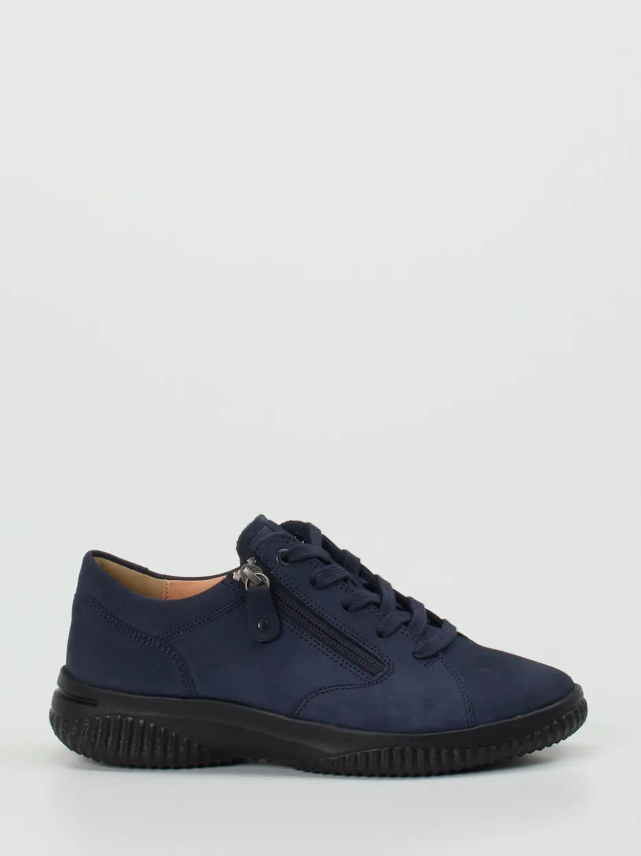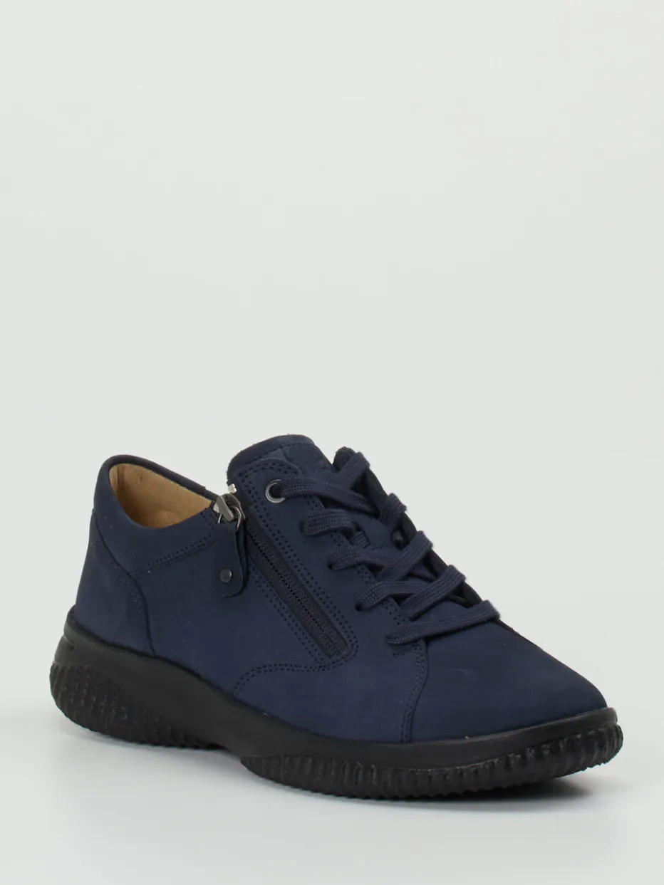 Für entspannte Stunden im urbanen Alltag bietet das Modell aus samtig angeschliffenem Nubukleder in Marineblau eine gelungene Symbiose aus Bequemlichkeit und dezentem Stil. Die klassische, runde Form wird durch breite Schnürsenkel, tonal gesetzte Nähte und dunkle Metallösen sportlich betont. Der seitliche Reißverschluss sorgt für müheloses Anziehen, die profilierte Gummisohle ist flexibel und rutschhemmend. Farblich harmonisch lässt sich dieser Sneaker zur Softshelljacke oder Stretchjeans kombinieren – optimal für einen aktiven, komfortbewussten Lifestyle.