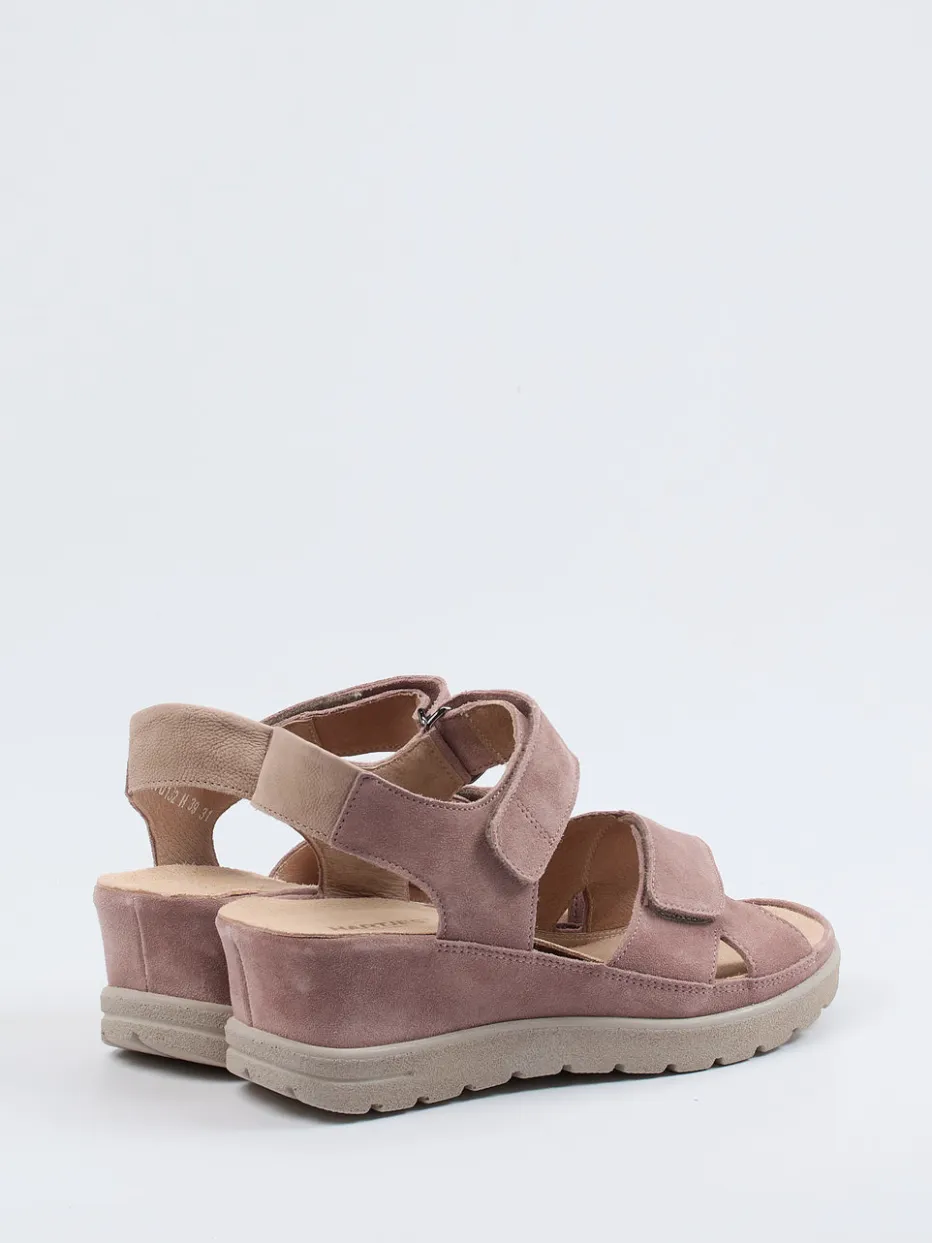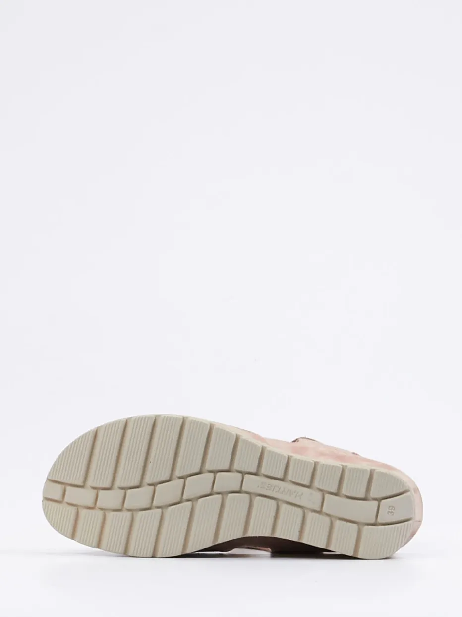 Perfekt für entspannte Tage im Freien überzeugt das Modell durch hochwertiges, samtig-mattes Veloursleder in Altrosa. Die offene, ergonomisch geschnittene Form mit einem Keilabsatz von 3 cm bietet angenehmen Halt – ergänzt durch verstellbare Klettverschlüsse für individuelle Anpassung. Ton-in-Ton-Nähte, profilierte Gummisohle und gepolsterte, lederbezogene Kork-Innensohle unterstreichen den komfortablen Charakter. Passend zur Soft-Neutrals-Trendpalette der Saison lässt sich die Sandale vielseitig zu Leinenstoffen oder leichten Sommerlooks tragen.
