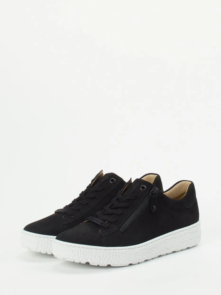Stilsicher durch den Alltag.Der Sneaker von Hartjes vereint Komfort und modernes Understatement in der Bequemschuh-Kategorie. Für aktive Tage mit langen Wegen bietet der schwarze Veloursleder-Sneaker samtig mattierter Oberfläche optimalen Halt und Tragekomfort. Die klassisch flache Form mit seitlichem Reißverschluss ermöglicht bequemes Anziehen, während Schnürung und gepolsterter Einstieg für optimale Passform sorgen. Die strukturierte weiße Gummisohle und das naturfarbene Lederfutter ergänzen das Gesamtbild geschmackvoll. Inspiriert von Streetwear und minimalistischen Trends passt der Schuh besonders gut zu hellen Jeans oder reduzierten Casual-Looks. Komfortabel, unkompliziert und mit typischer Hartjes-Leichtigkeit ausgestattet.