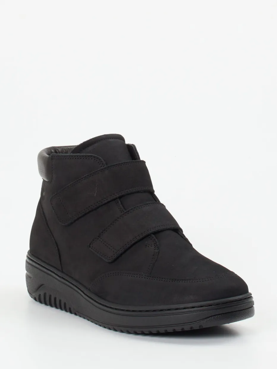 An kalten Tagen sorgt das kuschelige Lammfellfutter für wohltuende Wärme, während das schwarze Nubukleder mit samtiger Haptik in Verbindung mit Ton-in-Ton-Nähten und gepflegter Uni-Optik eine zurückhaltend elegante Wirkung erzielt. Zwei symmetrisch platzierte Klettverschlüsse bieten praktischen Einstiegskomfort, ergänzt durch einen weich gepolsterten Schaftrand aus Glattleder. Die knöchelhohe Form und das rutschhemmende Laufprofil unterstreichen die wintertaugliche Funktionalität. Kombinierbar zu Thermoleggings oder lässigen Winteroutfits.