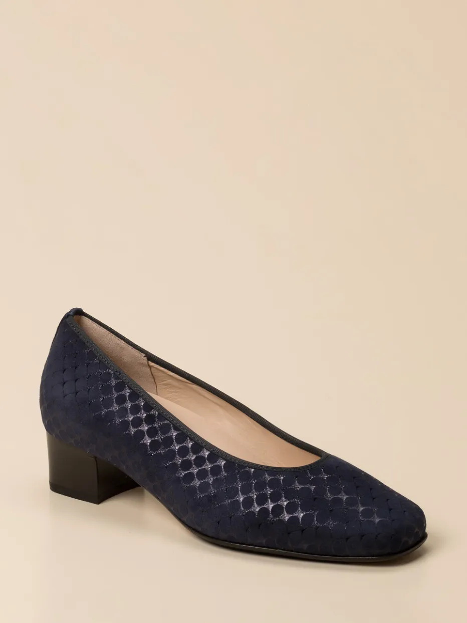 Eleganz mit Komfortanspruch.Hassia präsentiert einen Komfort-Pump der Linie Evelyn für Damen. Ideal für den Büroalltag oder City-Anlässe überzeugt dieser dunkelblaue Schlupfschuh durch geprägtes Veloursleder mit subtil-mattem Glanz. Die klassische Silhouette mit 3 cm hohem Blockabsatz sorgt für Stabilität, während der gepolsterte Wechselfußbett-Innenschuh aus Leder angenehmen Tragekomfort bietet. Der elastische Schuhrandeinfass und die halbe Gummi-Ledersohle ergänzen die praktische Ausstattung. Stilistisch bewegt sich das Modell im Spannungsfeld zwischen Quiet Luxury und dezenter 90er-Ästhetik. Komfortorientiertes Design mit einem Hauch zeitloser Raffinesse – typisch Hassia.