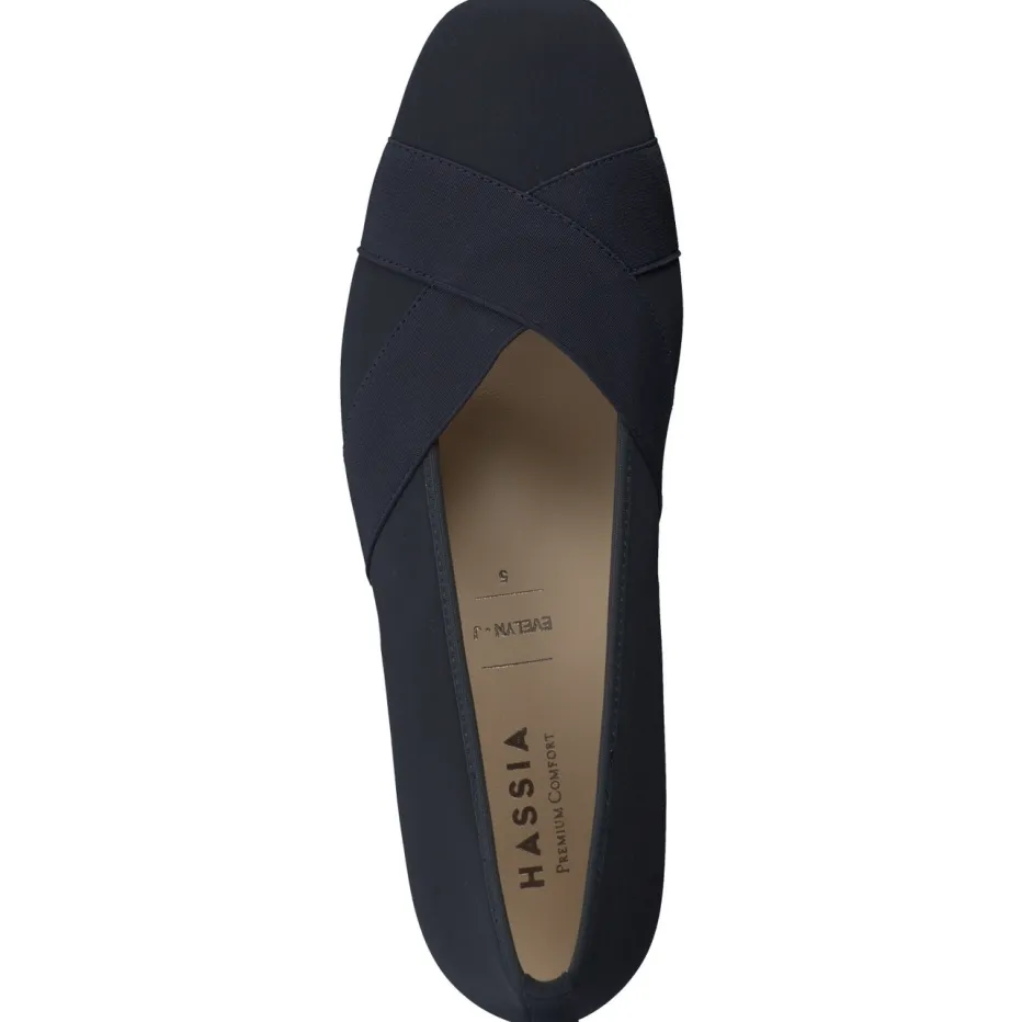 Eleganz mit Komfortanspruch.Die Marke Hassia präsentiert hier stilvolle Komfort-Pumps für Damen. Ideal für längere Bürotage oder gepflegte Freizeitlooks, überzeugen diese Pumps mit flexiblem Textil in mattem Dunkelblau, ergänzt durch elastische Kreuzbänder für sicheren Halt. Die gepolsterte Echtleder-Innensohle, die sich auch für Einlagen eignet, sorgt ebenso wie der 3 cm hohe, bezogene Blockabsatz für ganztägigen Komfort. Ton-in-Ton-Details unterstreichen den minimalistischen Look, der vom Trendbild „Quiet Luxury“ inspiriert ist. Ein vielseitiger Begleiter mit bequemem Fit, wie man ihn von Hassia erwartet.