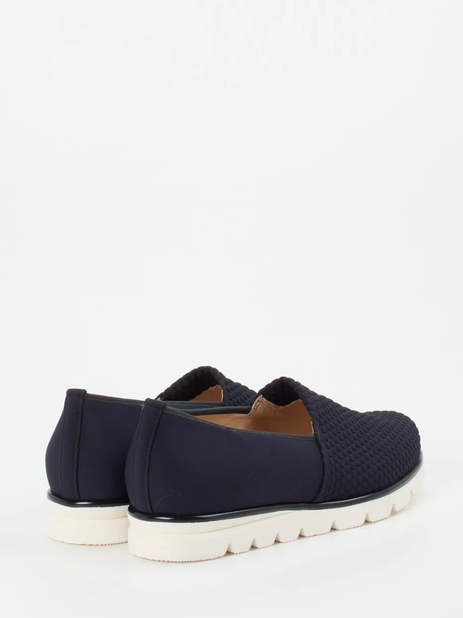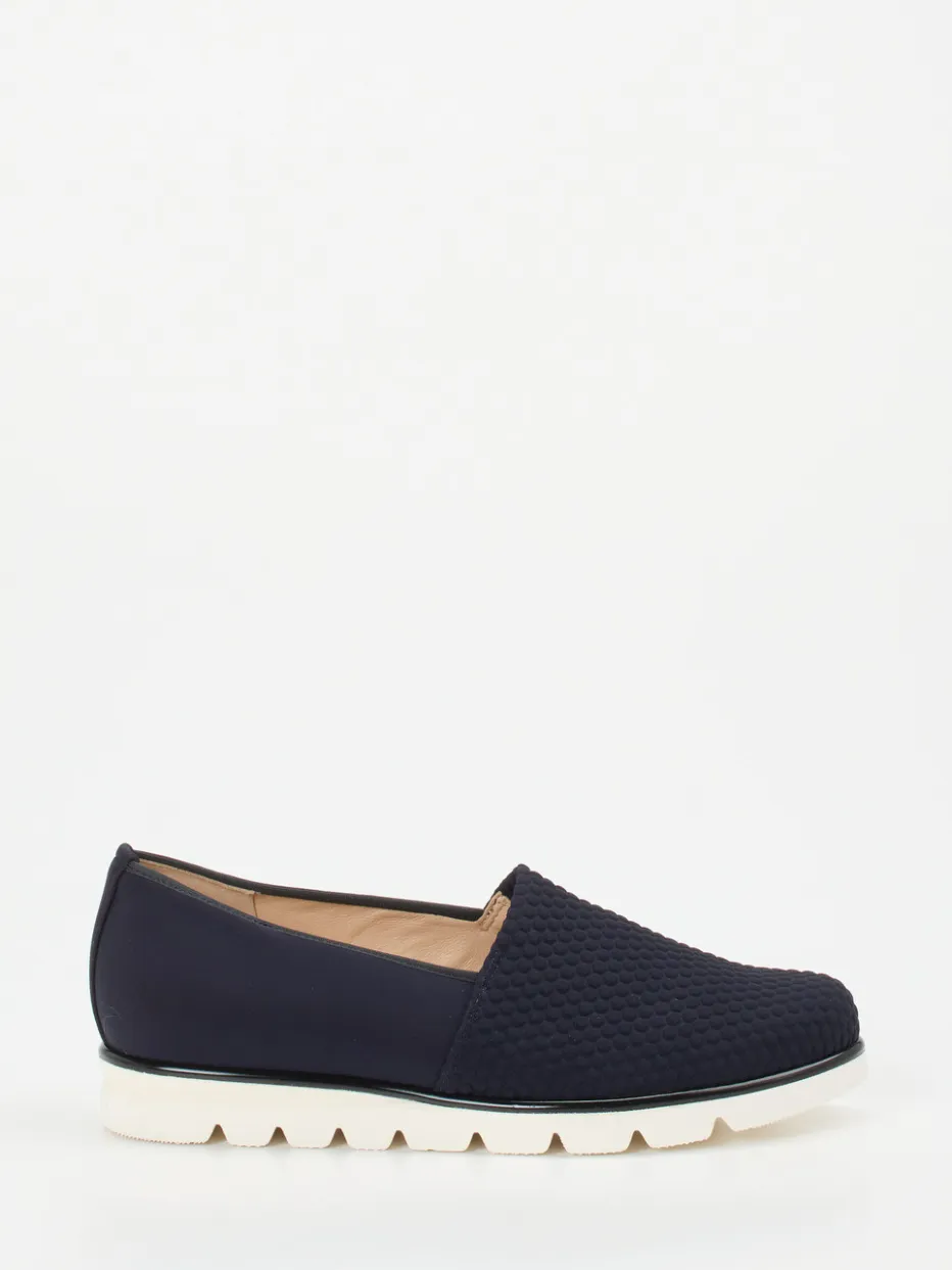Moderner Komfort für entspannte Tage.Die Marke Hassia präsentiert mit diesem Komfort-Slipper ein Modell für Damen mit einem hohen Anspruch an Bequemlichkeit und Schlichtheit. Ideal für Freizeit und Alltag bietet der sportive Schlupfschuh mit dunkelblauem Textilmaterial, matter Wabenstruktur und flacher, rund zulaufender Form ein zurückhaltend stilvolles Erscheinungsbild. Der elastische Einstieg erleichtert das Anziehen, während die rutschhemmende, weiße Leichtzellsohle mit Glanzkante sicheren Tritt verspricht. Die atmungsaktive Lederfütterung und das herausnehmbare Fußbett sorgen zusätzlich für angenehmes Tragen – auch mit Einlagen. Perfekt kombinierbar mit Stretch-Jeans oder Steppjacke. Hassia steht für wohldurchdachten Komfort mit urbanem Anspruch.