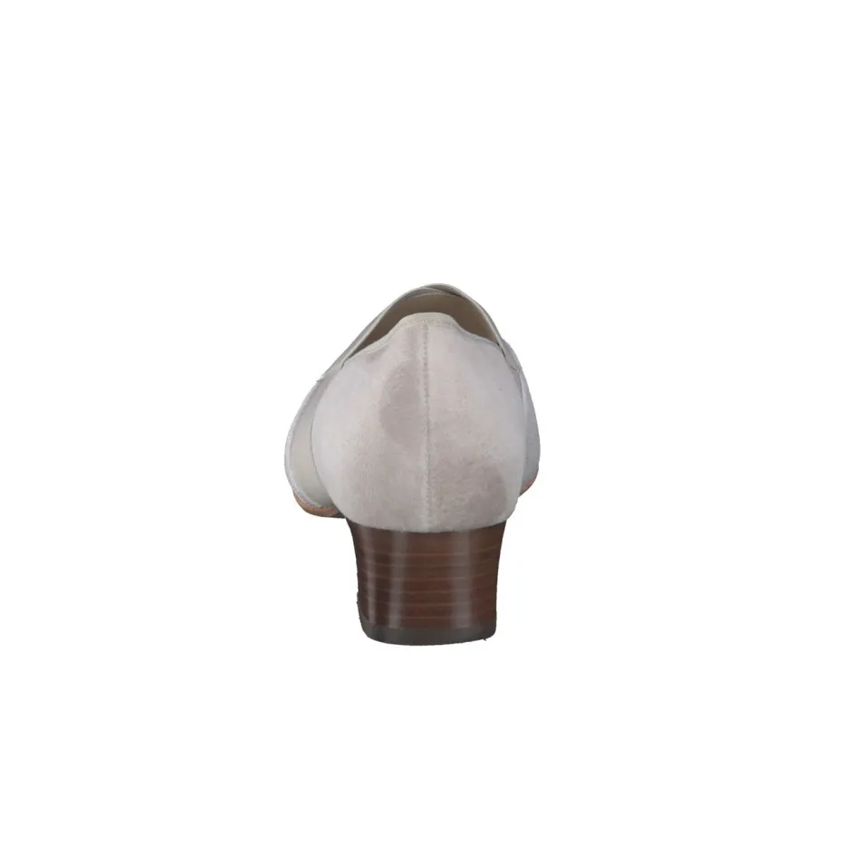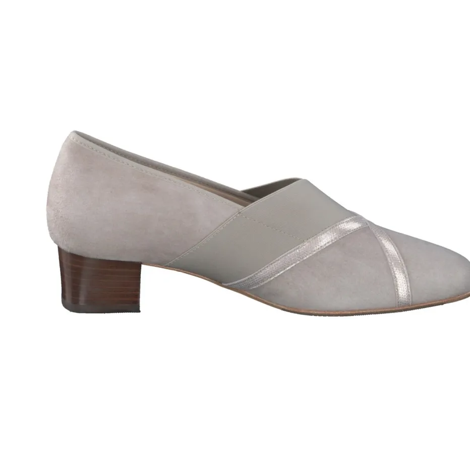 Als bequemer Alltagsbegleiter mit femininer Note eignet sich dieser Pumps ideal für Büro oder Freizeit. Das beigefarbene Veloursleder – samtig angeschliffen – kombiniert sich mit stilvollen Metallic-Bandapplikationen in Gold und breiten Elastik-Einsätzen, die für eine optimale Passform sorgen. Die schlanke Silhouette mit leichtem V-Ausschnitt sowie ein 3 cm hoher Blockabsatz in Holzoptik unterstreichen den klassischen Look. Innen bietet ein Lederfutter mit gepolstertem Wechselfußbett angenehmen Komfort. Dezente Quiet-Luxury-Anmutung trifft auf zeitlosen Chic.