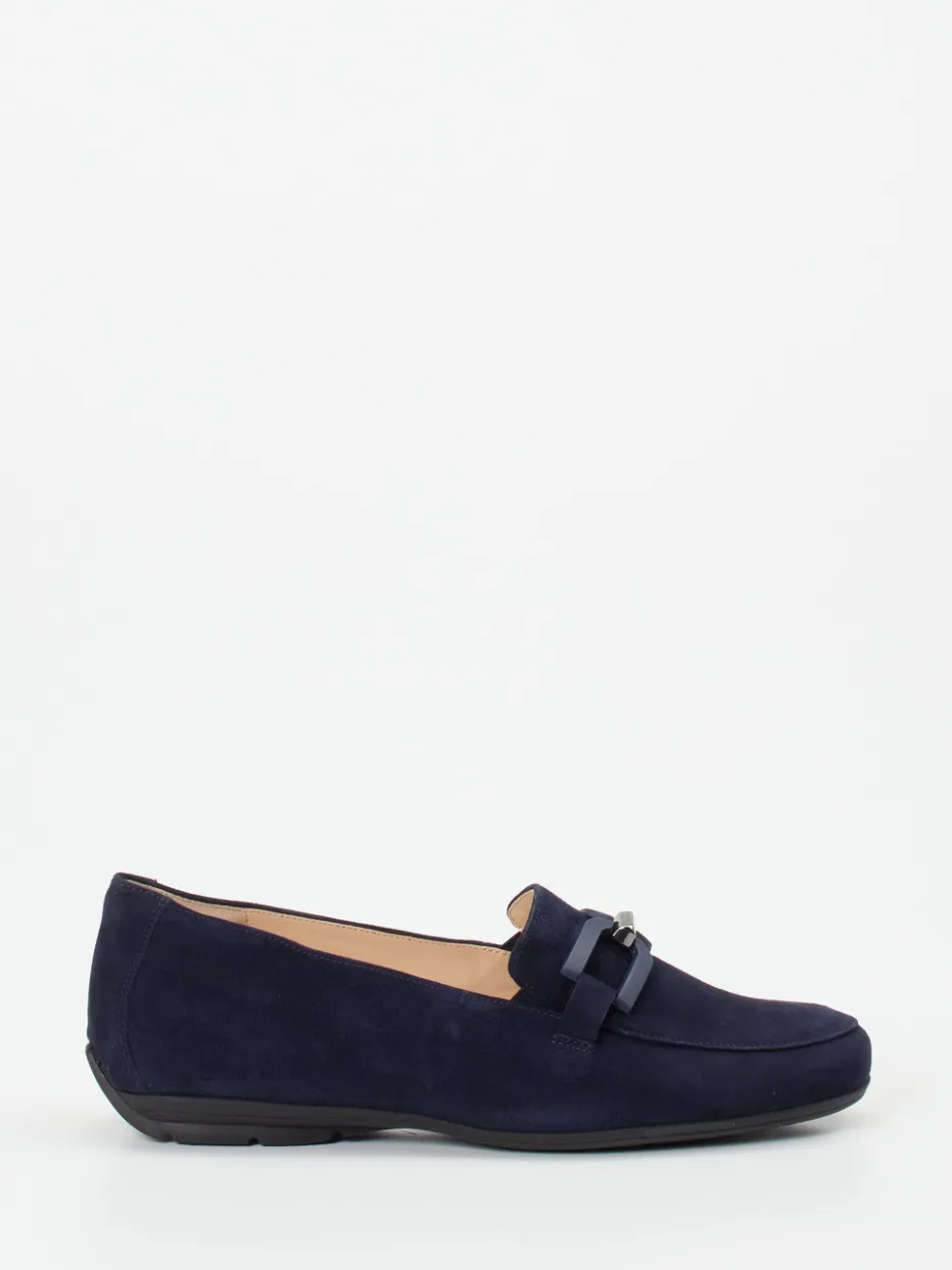Ideal für Arbeitsalltag und Freizeit besticht das Modell durch marineblaues Veloursleder, samtig angeschliffen und mit matter Oberfläche. Die klassische, flache Silhouette wird akzentuiert von einer Ton-in-Ton gestalteten Zierspange mit dunkler Metallmitte. Eine profilierte Gummisohle bietet sicheren Tritt, das gepolsterte Wechselfußbett in Weite G sorgt für angenehmen Laufkomfort – auch für Einlagen geeignet. Das Design folgt dem Trend „Quiet Luxury“ und eignet sich für vielseitige Ton-in-Ton Stylings.