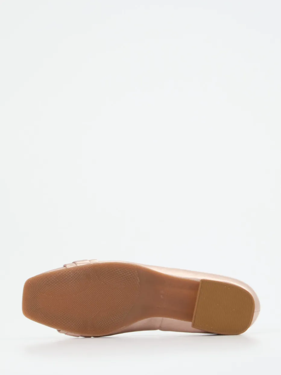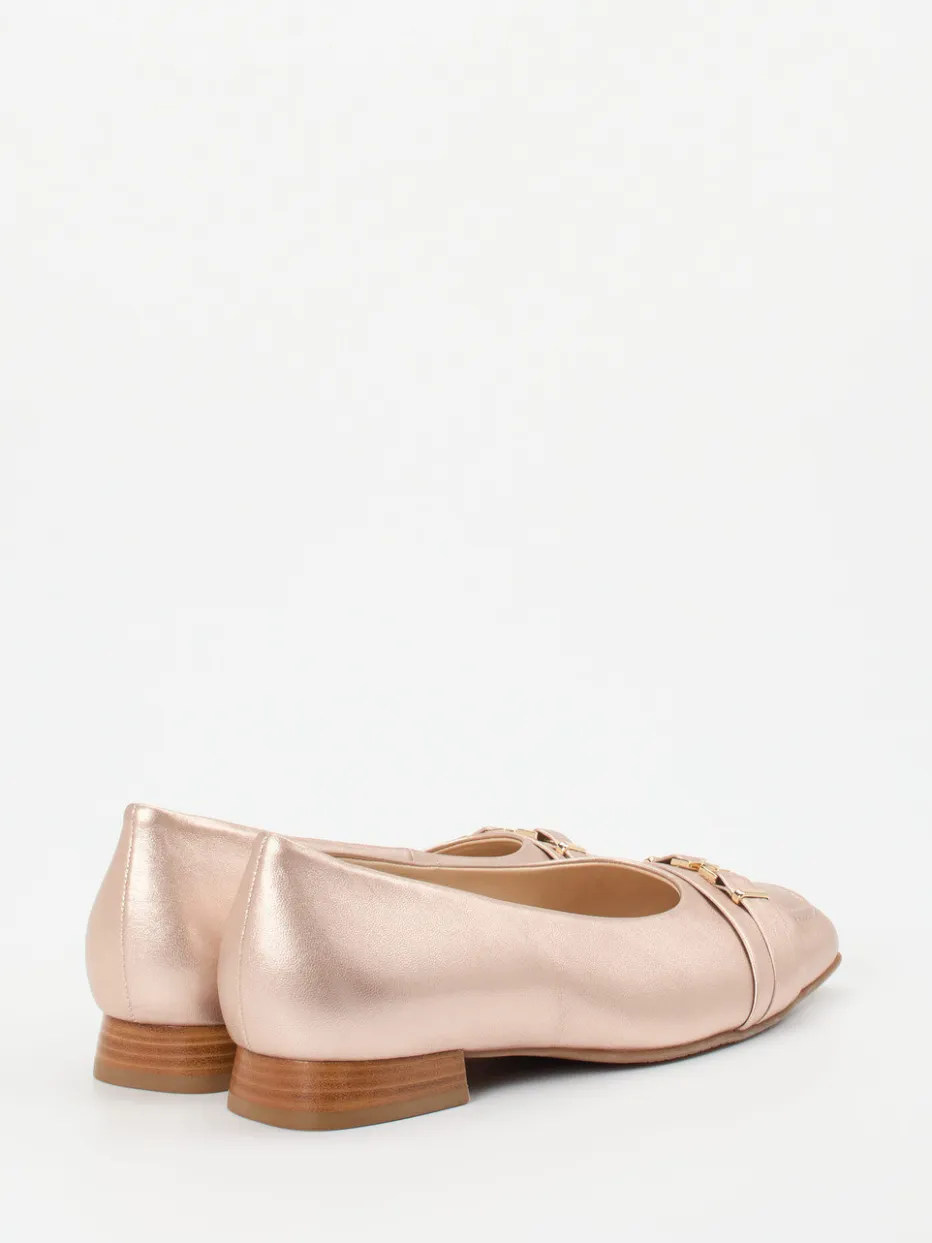 Ob im Büro oder bei gepflegten Freizeitlooks – der bequeme Blockabsatz und das wechselbare, lederbezogene Fußbett bieten ganztägigen Komfort. Das pudrige Metallicleder mit irisierendem Finish wird durch eine goldfarbene Trensenspange auf dem Carréleisten betont. Die klassische Silhouette in Schlupfform überzeugt mit schlichter Eleganz, während die roségoldene Farbgebung dezent dem „Quiet Luxury“-Trend folgt. Ideal kombinierbar mit hellen Business-Kleidern oder monochromen Ensembles.