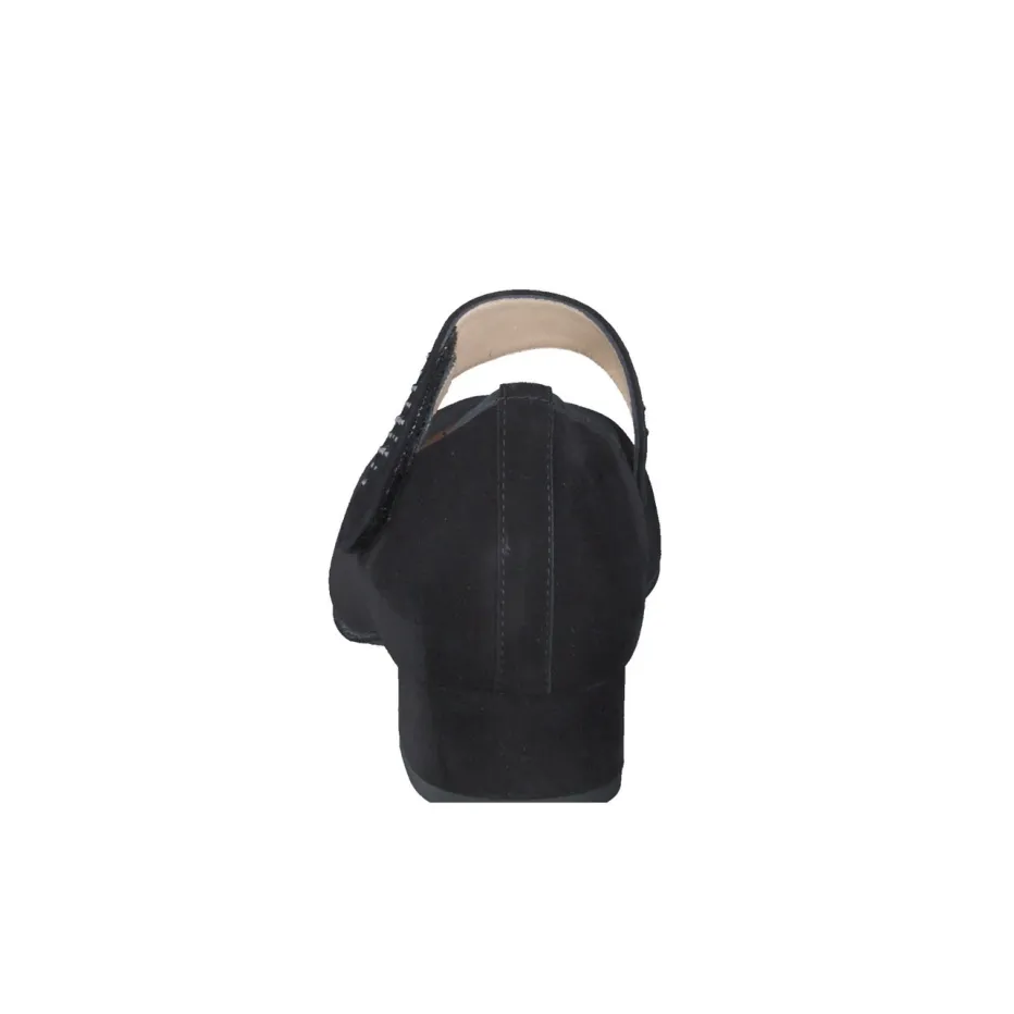 Ideal für lange Bürotage oder stilbewusste City-Termine: Das Modell in schwarzem, samtig angeschliffenem Veloursleder bietet dank ergonomischem Schnitt und Weite K spürbaren Laufkomfort. Der asymmetrisch positionierte Klettverschlussriemen mit dunklen Swarovski-Steinen sorgt für einen dezenten Glanzakzent. Der 3 cm hohe Blockabsatz ist stabil und alltagstauglich. Schlicht gerundete Linien unterstreichen die feminine Retro-Anmutung – passend zur „Quiet Luxury“-Ästhetik. Für zusätzlichen Nutzen bietet das herausnehmbare Fußbett Platz für orthopädische Einlagen.
