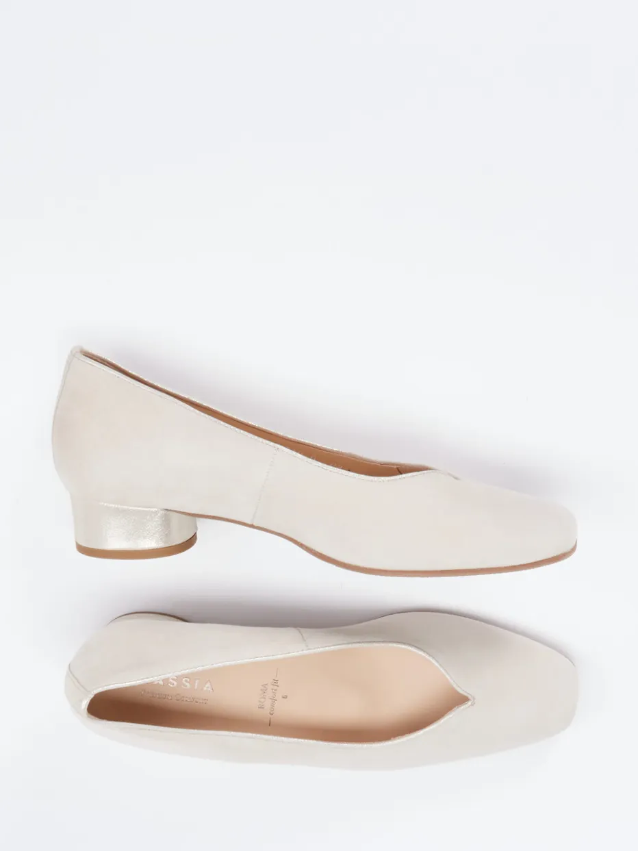 Stilvoller Komfort für besondere Anlässe.Der Damenpumps von Hassia überzeugt als eleganter Begleiter zu Business-Outfits oder festlichen Looks. Feinstes Veloursleder in sandbeiger Farbgebung trifft auf ein sanft schimmerndes Metallic-Detail am Blockabsatz. Der leicht geschwungene V-Ausschnitt in Kombination mit der tonalen Einfassung unterstreicht die zurückhaltend feminine Silhouette. Innen sorgt ein Lederfutter mit auswechselbarem Fußbett für angenehmen Komfort. Der Look fügt sich nahtlos in aktuelle „Quiet Luxury“-Trends ein. Die Luftpolstersohle ist funktional durchdacht, der Blockabsatz gibt sicheren Halt. Ein zeitloser Schuh mit bequemer Weite H aus der Hassia Komfortkollektion.