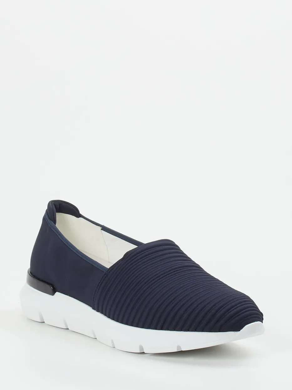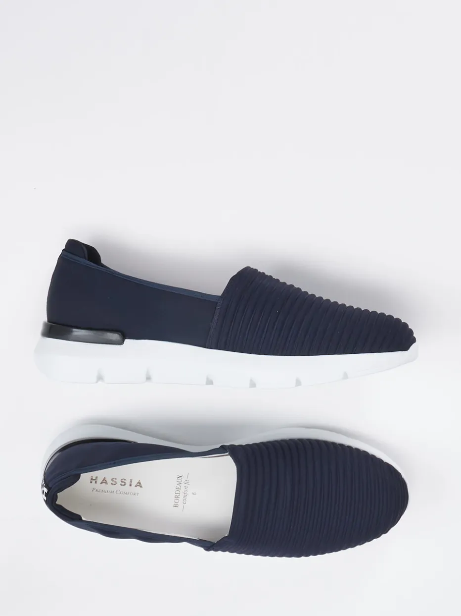 Maritimer Chic trifft Leichtkomfort.Hassia überzeugt mit einem Damen-Komfort-Slipper für lässige Alltagsanlässe. Das dunkelblaue Stretchmaterial mit gerippter Textur sorgt zusammen mit dem elastischen Einstieg für eine bequeme Passform. Innen punktet das Modell mit weichem Lederfutter und einem herausnehmbaren Vario-Wechselfußbett. Die flache, weiße Gummisohle mit Profilierung unterstützt einen angenehmen Gang. Das subtile Logo-Tape an der Ferse verleiht sportiven Feinschliff. Ideal für alle, die minimalistisch und komfortbetont unterwegs sind – ob zu Jeans oder Softshelljacke. Hassia bietet kompromisslosen Komfort in modernem Design.