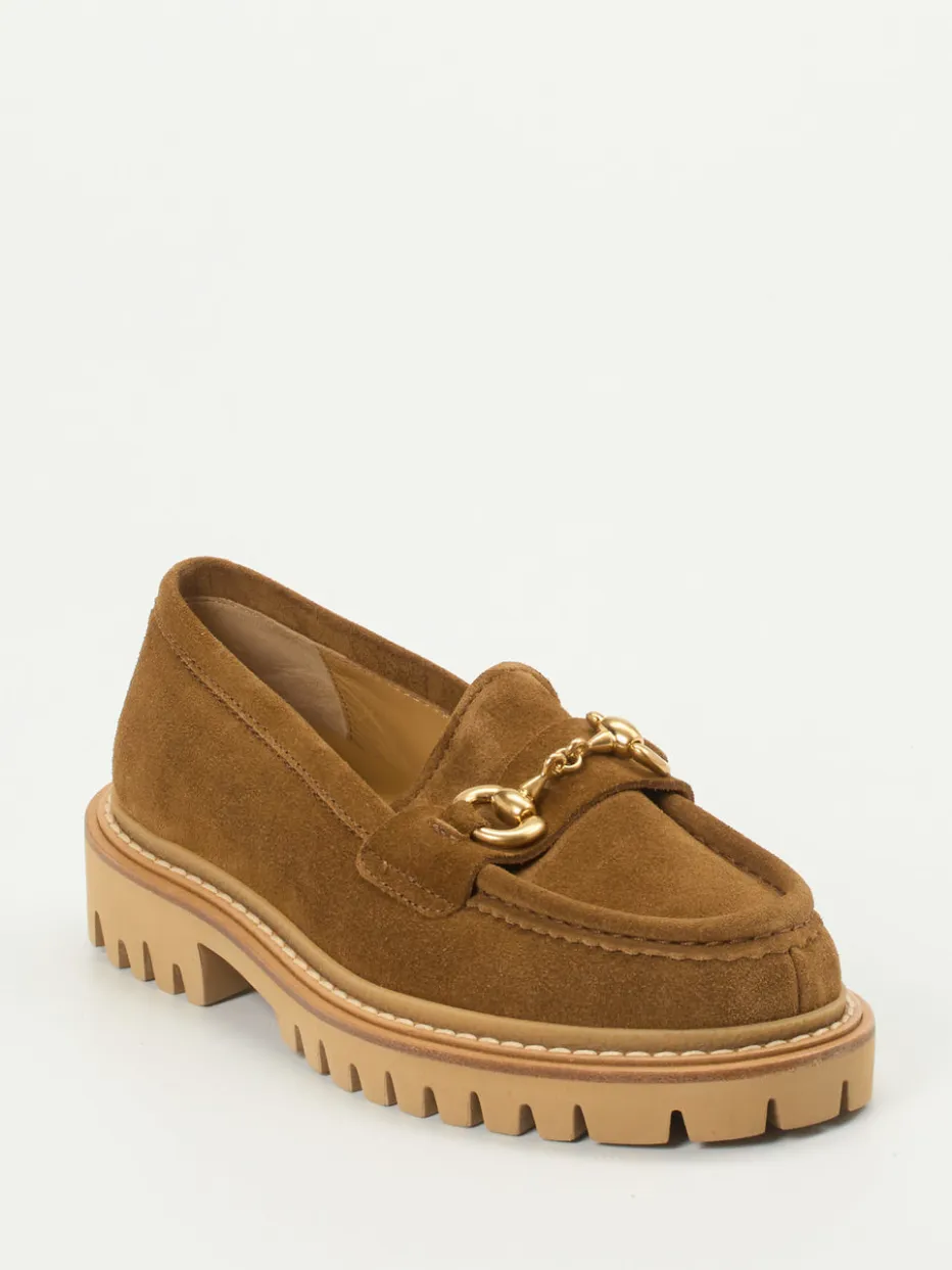 Dieser luxuriöse Damenloafer vereint weiches Veloursleder mit klarem Preppy-Design und setzt mit goldener Trensenspange sowie markanter Chunky-Sohle modische Akzente.