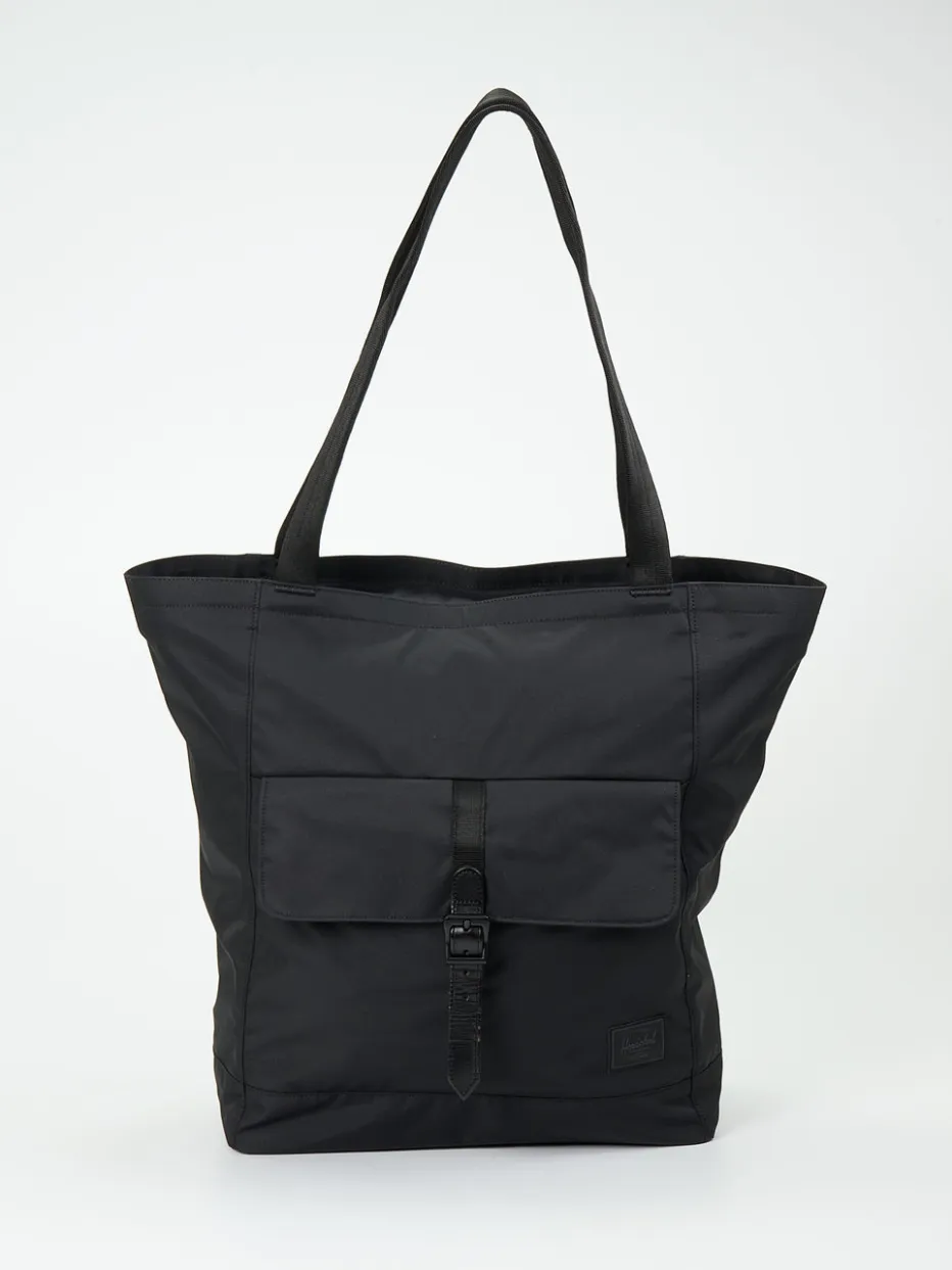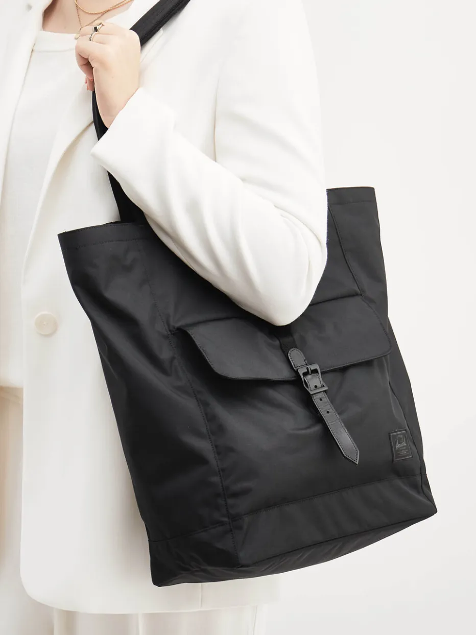 Urbaner Chic trifft auf Funktionalität: Der schwarze Herschel-Shopper überzeugt mit nachhaltigem Material, klarer Form und praktischen Details für Alltag und Büro.