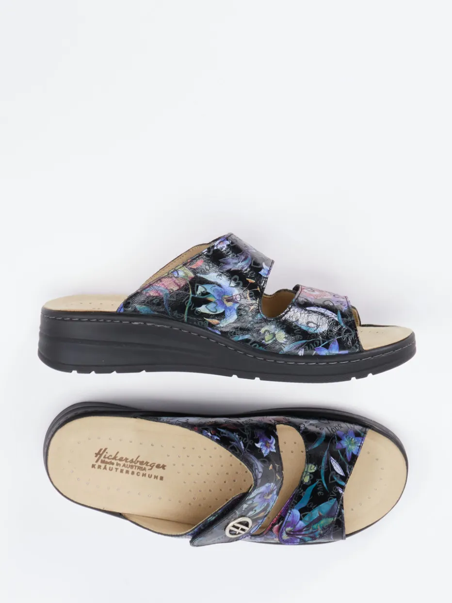 Farbenfreude trifft Komfortcharakter.Die Marke Hickersberger steht für durchdachte Bequemschuhe – wie diese Damen-Pantolette beweist. Für entspannte Stunden zu Hause oder ausgedehnte Tage unterwegs bietet das Modell mit ergonomisch geformter Sohle und bewährtem Kräuter-Fußbett spürbare Entlastung. Geprägtes Leder mit glänzendem floralen Allover-Print, kombiniert mit silberfarbener Logoniete und Herzdetails auf schwarzem Grund, verleiht dem Komfortmodell einen modisch-lebendigen Appeal. Zwei stufenlos verstellbare Klettverschlüsse versprechen optimalen Halt, die flach-keilförmige Synthetiksohle wirkt rutschhemmend und federnd. Inspiriert von aktuellen „Comfort Core“-Looks überzeugt dieser Schuh auch in casual-sommerlichen Stylings. Hickersberger-typischer Funktionalkomfort im frischen Trendgewand.