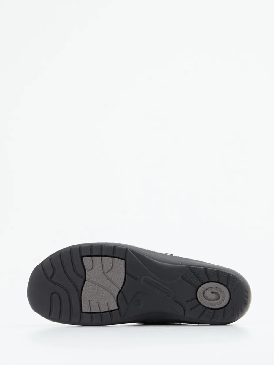 Für stilvolle Bequemlichkeit im Alltag.Die Marke Hickersberger präsentiert eine Komfort-Pantolette mit anatomisch geformtem Kräuterfußbett. Die offene, ergonomisch geformte Silhouette in Dunkelblau kombiniert geprägtes Leder mit einem floralen Metallic-Print und glänzender Oberfläche. Zwei verstellbare Klettverschlüsse sorgen für perfekten Sitz, während ein silberfarbener Metallknopf das Design akzentuiert. Die gepolsterte Innensohle trägt zum hohen Laufkomfort bei. Eine dunkel abgesetzte PU-Keilsohle mit Kontrastnähten ergänzt den femininen Look. Optimal für Freizeit, Zuhause oder entspannte Momente – besonders für modebewusste Trägerinnen mit Komfortanspruch. Authentische Wohlfühlästhetik mit funktionalem Anspruch – Hickersberger-typisch.