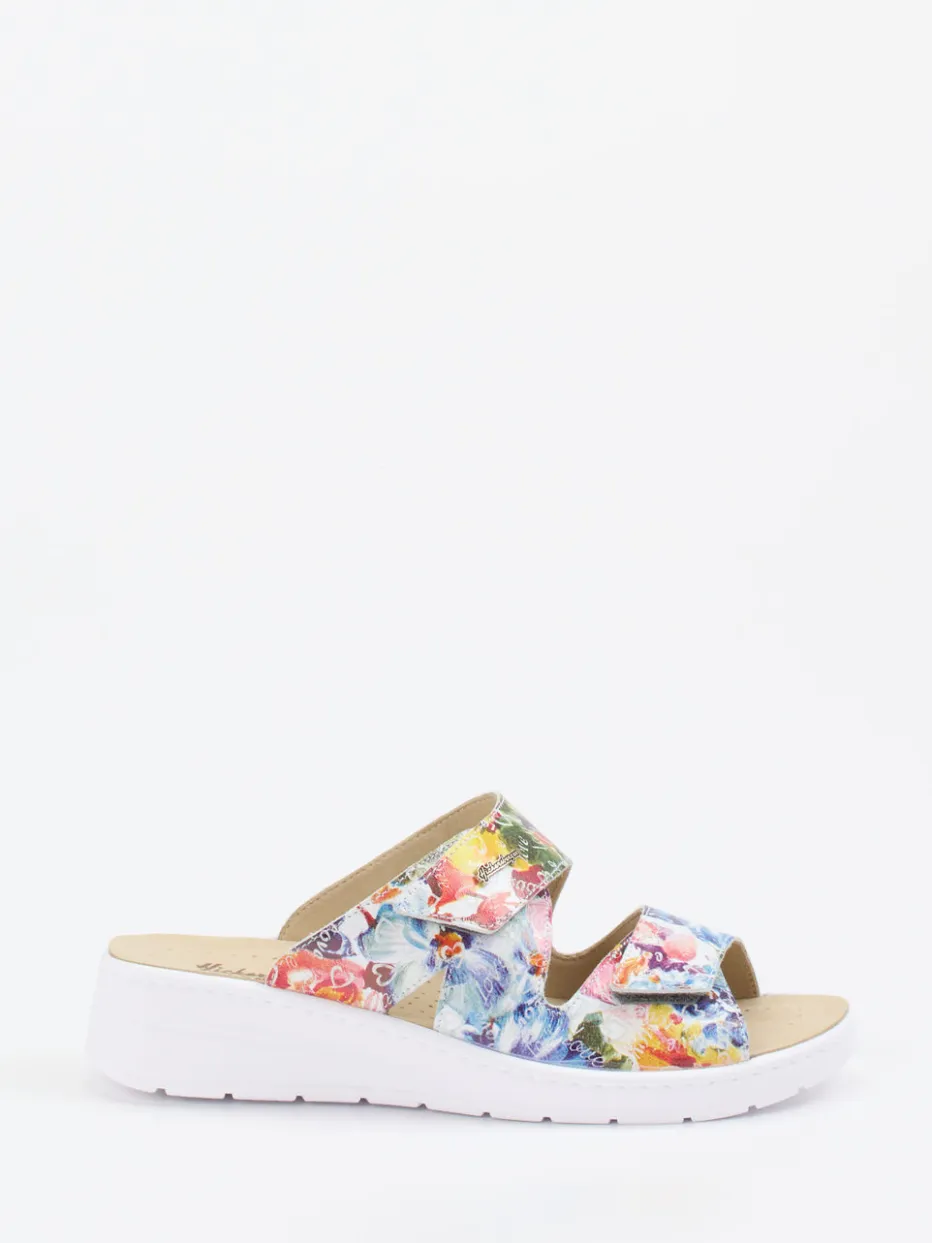Sommerlicher Komfort in floraler Optik.Die Marke Hickersberger bringt mit dieser Komfort-Pantolette frischen Schwung in die Frühjahr-/Sommersaison. Ideal für entspannte Spaziergänge oder erholsame Stunden zu Hause: Der farbenfrohe Multicolor-Blumenprint kombiniert mit einer glänzenden Lederoberfläche sorgt für eine fröhliche Ausstrahlung. Zwei stufenlos regulierbare Klettverschlüsse ermöglichen perfekte Anpassung. Die ergonomisch geformte PU-Sohle mit leichter Keilform bietet Stabilität und rutschhemmenden Halt. Herzmotive und „Love“-Schriftzüge unterstreichen den liebevollen Look. Ein Modell, das Komfort mit trendigem Blütencharme vereint – typisch Hickersberger.