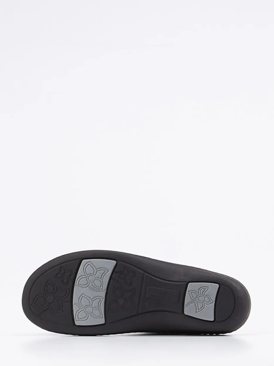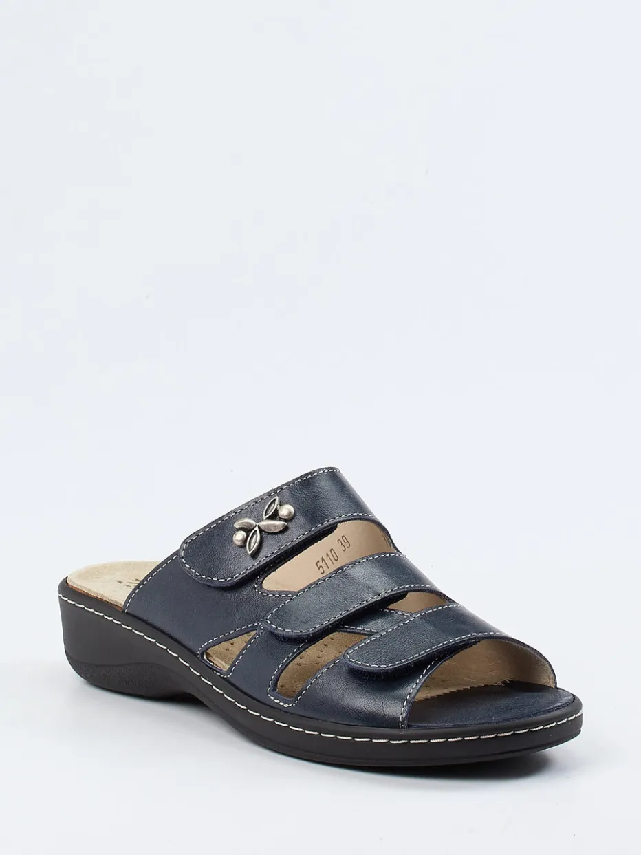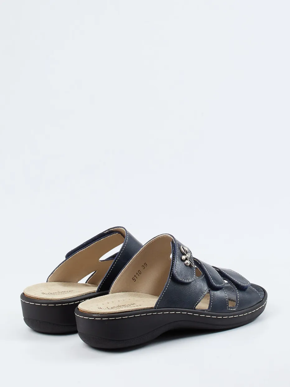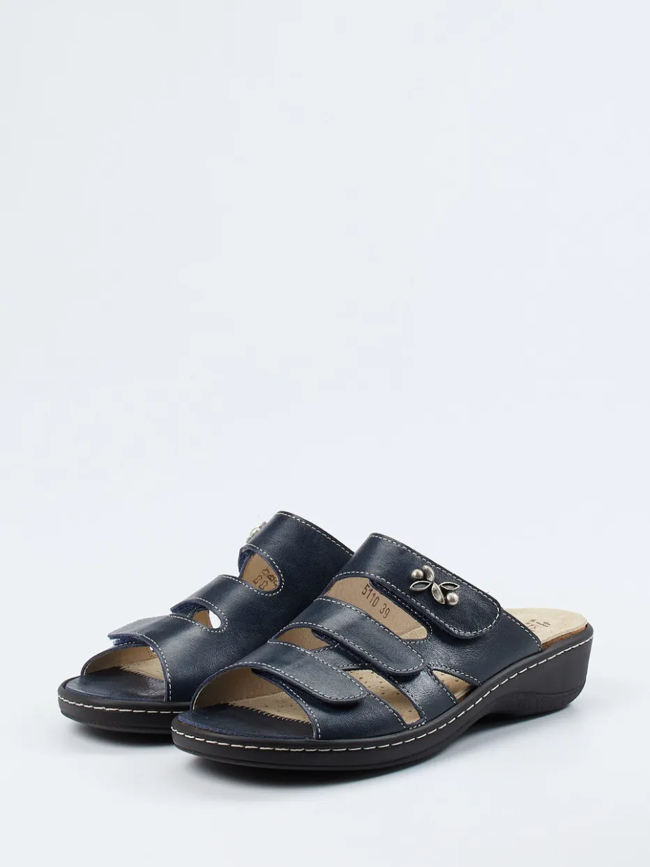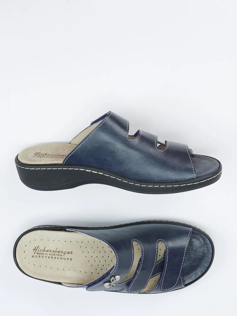 Wohltuender Komfort für entspannte Tage.Hickersberger präsentiert eine Damen-Komfortpantolette mit Fokus auf ergonomischer Bequemlichkeit. Ideal für zu Hause oder unterwegs: Das dunkelblaue Kalbleder besticht durch seine matte Optik und wird von einer silberfarbenen Agraffe und Kontrastnähten akzentuiert. Die offene, ergonomisch geformte Silhouette mit drei Klettverschlüssen erlaubt individuelle Anpassung. Das wechselbare Fußbett aus Naturkork ist mit weichem Leder bezogen, eine Kräutereinlage sorgt für zusätzliche Frische. Die rutschhemmende PU-Sohle bietet sicheren Halt. Stilistisch verbindet das Modell minimalistischen Chic mit gesundem Fußklima. Der funktionale Komfortschuh für entspannte Stunden mit Hickersberger-Qualität.