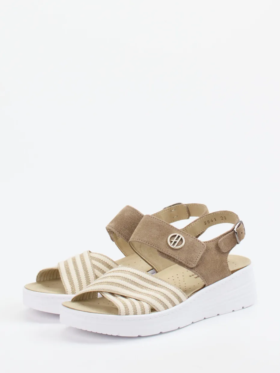Sommerkomfort in natürlichem Look.Die Marke Hickersberger präsentiert eine Damen-Komfortsandale mit durchdachter Ausstattung und dezentem Design. Für entspannte Tage im Alltag überzeugt dieses Modell mit ergonomischem Fußbett und einer leicht erhöhten PU-Sohle mit Dämpfung. Das beige Textilmaterial mit samtigem Veloursleder-Finish trifft auf gestreifte Riemen und metallische Details. Der Klettverschluss mit zusätzlicher Schnalle ermöglicht individuelle Anpassung, während das natürliche Farbschema aktuelle Soft-Neutrals-Trends aufgreift. In Kombination mit Leinenhosen oder Sommerkleidern entsteht ein harmonischer Casual-Look. Der spürbare Mehrwert: Funktionalität und Komfort mit visuellem Feinsinn.