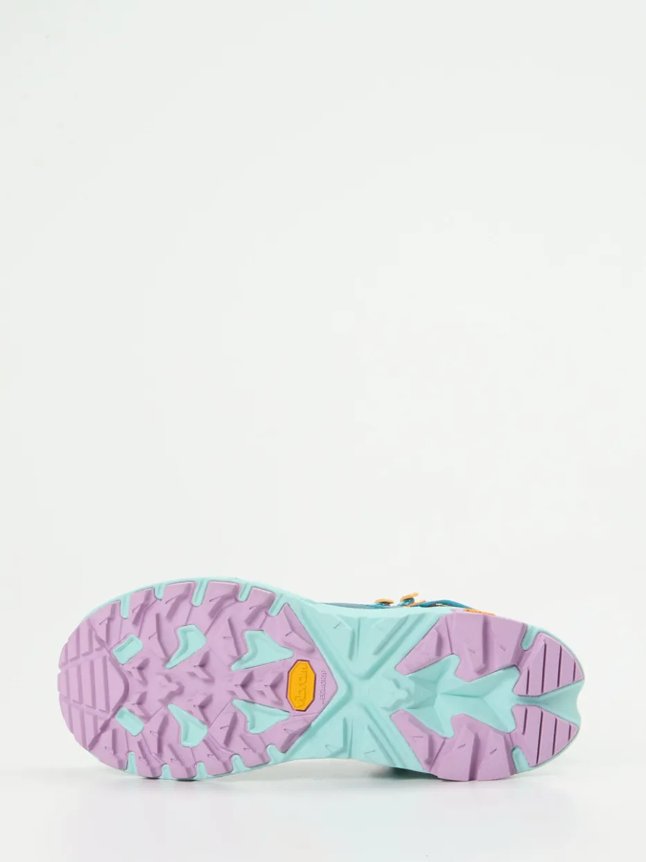 Performance für jedes Terrain.Die Marke HOKA präsentiert robuste Trailrunning-Schuhe in charakteristisch hoher Silhouette. Wind- und wasserabweisendes Mesh mit GORE-TEX-Membran schützt zuverlässig bei Outdoor-Aktivitäten, während Synthetik-Overlays zusätzliche Stabilität verleihen. Petrolblau dominiert das Design, ergänzt durch Akzente in Mintgrün, Flieder und Gelb. Die sportlich-voluminöse Form, Vibram-Profilsohle sowie die Schnürung mit farbigen Ösen unterstreichen den funktionalen Anspruch. Inspirierter Streetwear-Look trifft auf Wandertauglichkeit – ganz im Zeichen des Color-Blocking- und Gorpcore-Trends. Für Outdoor-Ästhetik mit technischer Überlegenheit – typisch HOKA.