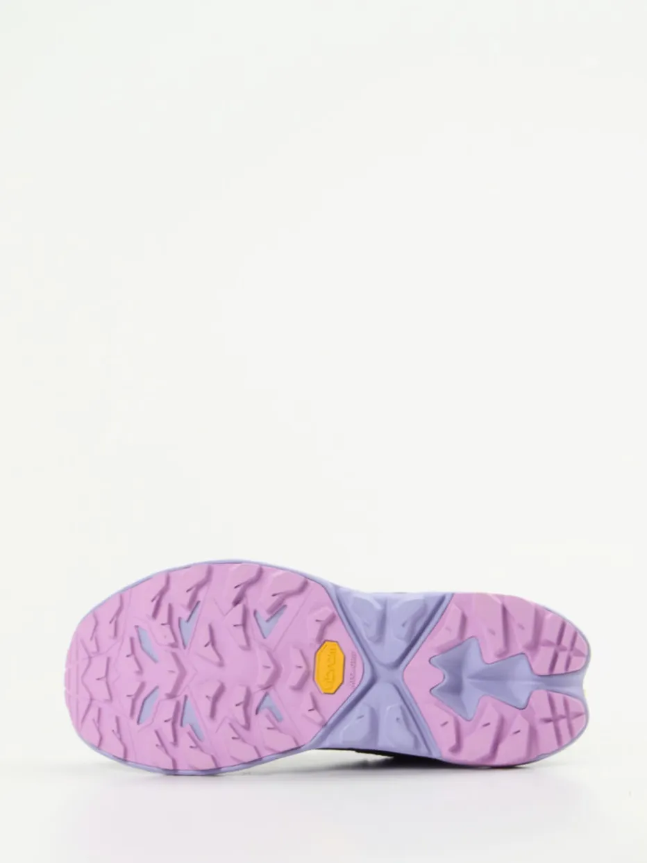 Funktion trifft Farbe auf dem Trail.Die Marke HOKA präsentiert mit diesem Trailrunning-Sneaker ein Modell für anspruchsvolle Outdoor-Enthusiasten und stilbewusste Großstadtaktive. Wind- und wasserdicht dank atmungsaktiver GORE-TEX-Membran und gefertigt aus recyceltem Mesh und Nubukleder mit samtig-matter Oberfläche, überzeugt der Schuh durch seine violette Grundfarbe und markante Color-Blocking-Akzente in Pastellrosa und Neongelb. Die ausladende Silhouette und robuste, hochprofilierte Gummisohle mit Vibram-Label bieten zuverlässigen Grip. Zuglasche und Schnürung aus Recyclingmaterial unterstreichen den funktionalen Charakter. Ein Progressiv-Sneaker mit Trail-Aesthetic und modischer Souveränität im Streetwear-Kontext – robust, leicht und auffällig gestaltet für vielseitige Einsätze.