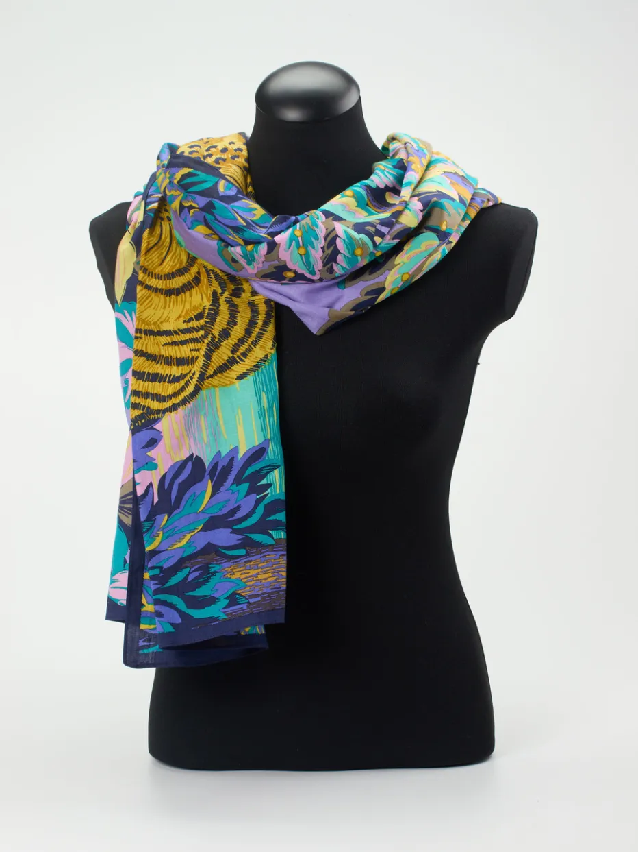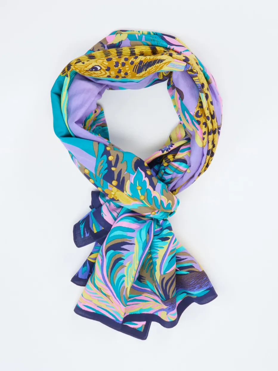 Farbenfroh vor einem violett-grünen Hintergrund und ein echter Eyecatcher: Dieses Tuch der Marke Inouitoosh begeistert auf den ersten Blick! Das tropische Szenario mit den beiden Großkatzen, dem Strand, Bananenstauden und Palmen macht Lust auf den Sommer. Der luxuriöse Mix aus Baumwolle und Seide ist atmungsaktiv und jederzeit angenehm zu tragen. Ein Kleidungsstück mit Stilbewusstsein und Ausdrucksstärke! – Material: 63 % Baumwolle 37 % Seide – Maße: ca. 100 x 190 cm – Pflegehinweis: Handwäsche