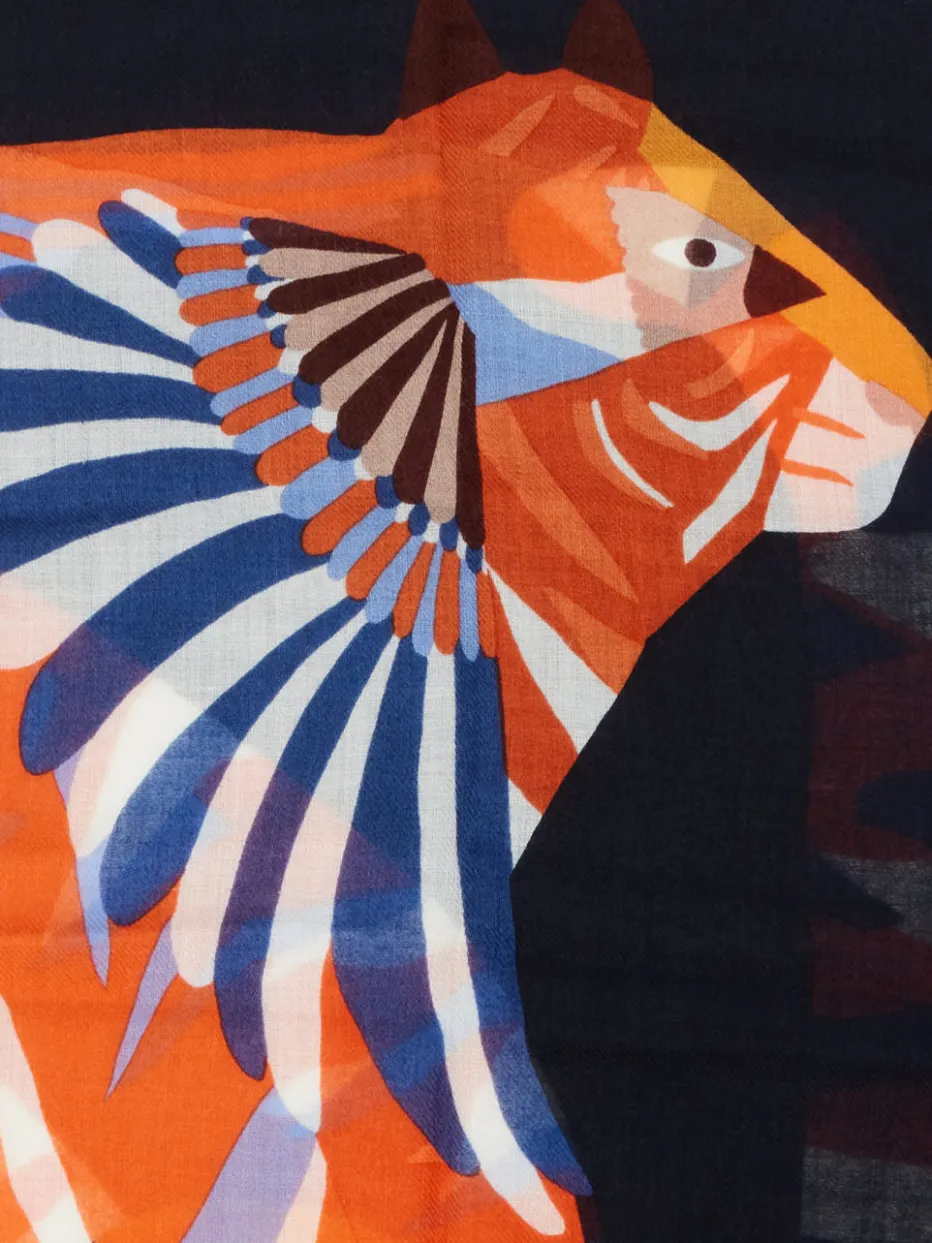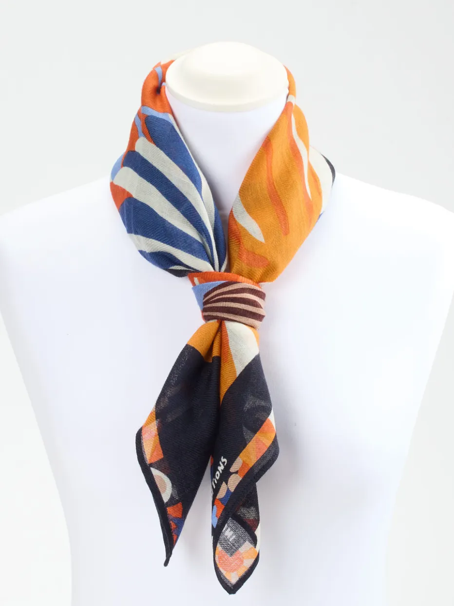 Dieses quadratische Halstuch von Inouitoosh verbindet weiche Wolle mit einem lebendigen Motiv in Orange und Blau – ein stilvolles Accessoire für trendbewusste Looks.