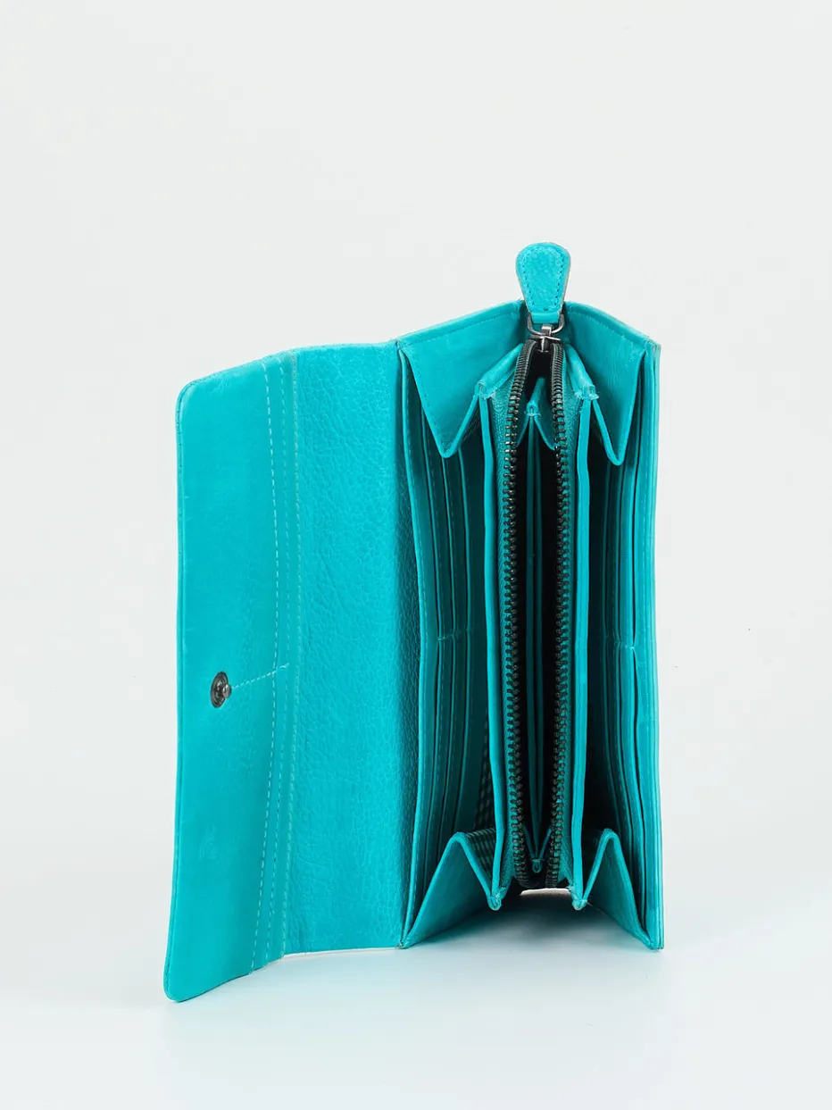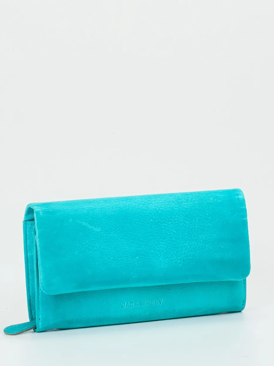 Die Marke Jack Kinsky präsentiert diese Geldbörse aus der Serie Nassau in einem tollen Farbton! Das hochwertige, türkisfarbene Kalbleder überzeugt durch die modische Struktur in angesagter Vintage-Optik und ist butterweich gearbeitet. Karten, Bargeld und Belege können dank der großzügigen Aufteilung sicher und praktisch verstaut werden. Für den Schutz Ihrer persönlichen Daten verfügt diese Geldbörse zusätzlich über einen zuverlässigen RFID-Blocker. Das eingravierte Markenemblem ziert unverkennbar. – Material: Kalbleder – Futter: Textil/Leder – Farbe: türkis – Größe: ca. 12 x 19 x 4 cm (H x B x T) – Innen: 18 Steckfächer, zwei Geldscheinfächer, zwei Belegfächer, ein zweigeteiltes Münzfach mit einem innenliegendem Fach sowie Reißverschluss – Verschluss: Überschlag mit Druckknopf