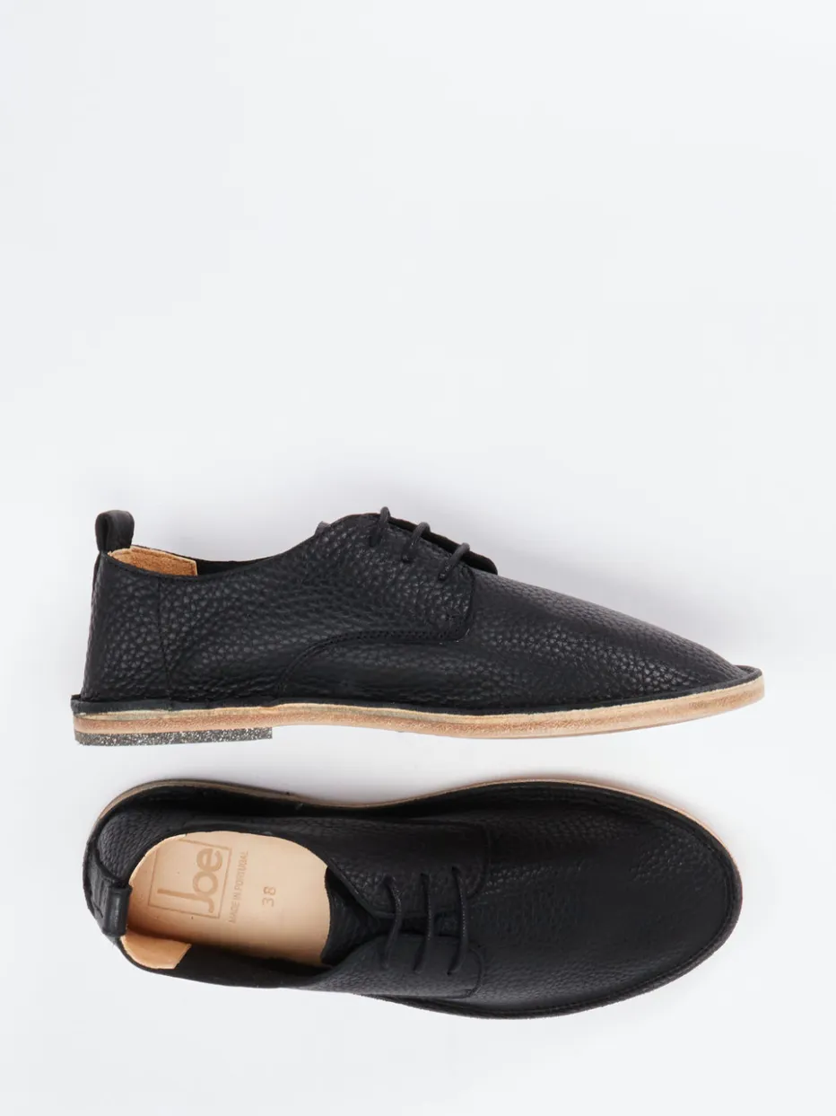Ein schwarz genarbter Derbyschuh von Joe, der minimalistisches Design mit handwerklicher Raffinesse verbindet – gefertigt aus hochwertigem Kalbleder mit Ledersohle und gummierter Ferse.