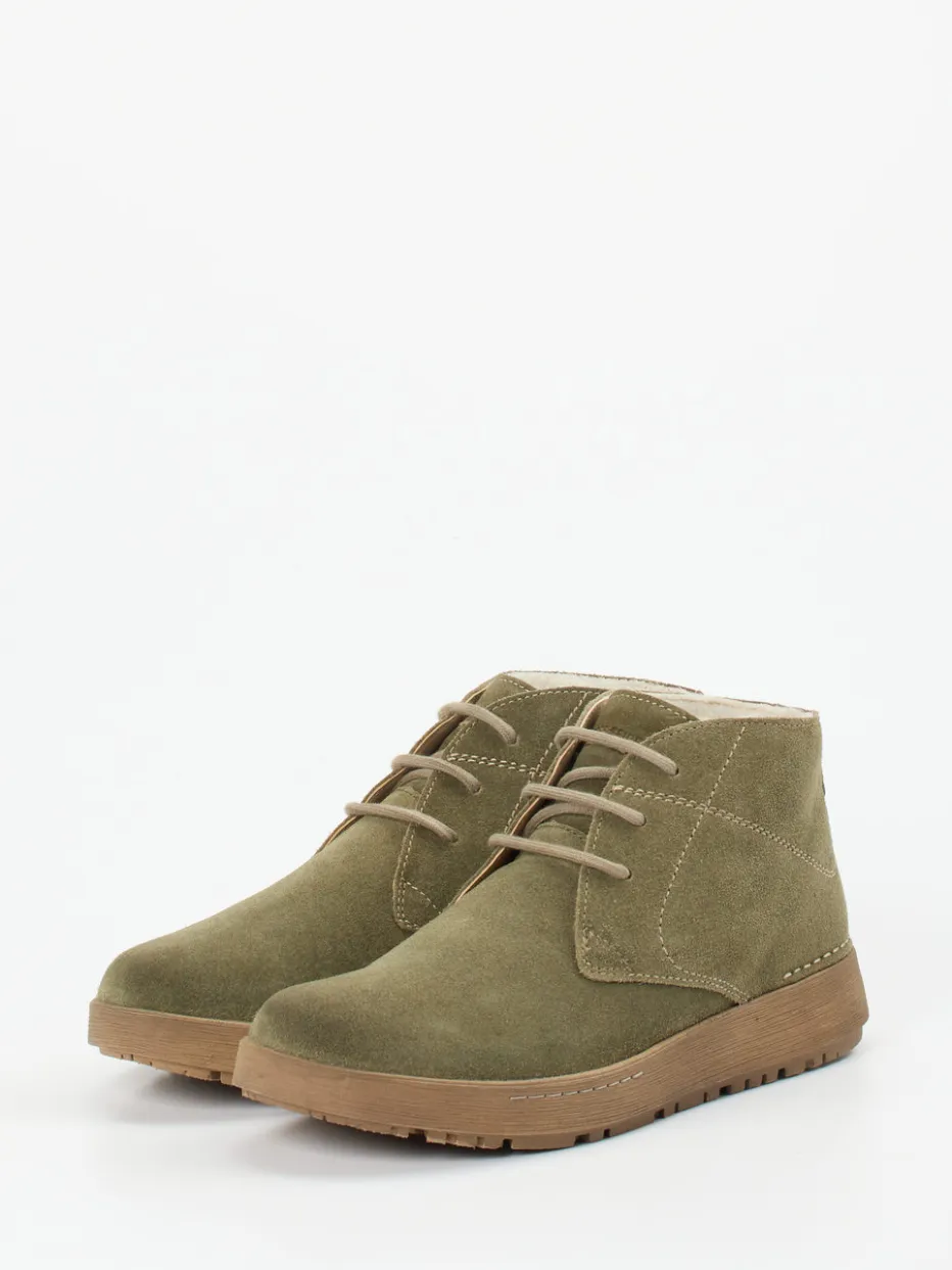 Casual-Komfort in natürlichem Look.Josef Seibel präsentiert mit dieser Schnürstiefelette eine bequeme Damen-Desert-Boots-Variante für den Herbst/Winter. Ideal für lange Spaziergänge oder den entspannten Alltag – das anschmiegsame Veloursleder mit matter Oberfläche trifft auf ein wärmendes Textilfutter. Der olivgrüne Farbton wirkt erdig und vielseitig kombinierbar, tonale Ziernähte und ein Kontrastbesatz an der Ferse akzentuieren das Design. Eine robuste Gummisohle mit griffigem Profil sorgt für Trittsicherheit. Durch die runde, knöchelhohe Silhouette und die Schnürung ergibt sich ein lässiger Minimal-Look im Einklang mit aktuellen „Natural Tones“ und „Comfort Core“-Strömungen. Ein Wohlfühlschuh mit Stil – gefertigt mit handwerklichem Anspruch von Josef Seibel.