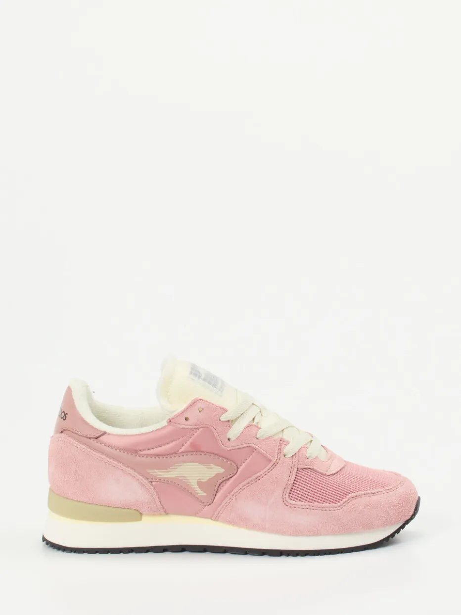 Der Damen-Sneaker von Kangaroos vereint Laufkomfort mit einem trendbewussten Design. Für relaxte City-Ausflüge oder spontane Erledigungen bietet der Sneaker eine stilvolle Mischung aus Veloursleder mit samtiger Struktur und atmungsaktivem Mesh. Der pastellige Grundton in Altrosa wird durch cremeweiße sowie hellgoldene Akzente aufgelockert, insbesondere an der Ferse. Seitliche Logo-Applikation, gepolsterte Zunge und griffige Gummisohle unterstreichen den sportiven Charakter. Der Look referiert klar den „Retro Runner Revival“-Trend und lässt sich mühelos mit soften Tönen kombinieren. Komfort, Stil und Individualität – Kangaroos setzt ein feminines Streetstyle-Statement.