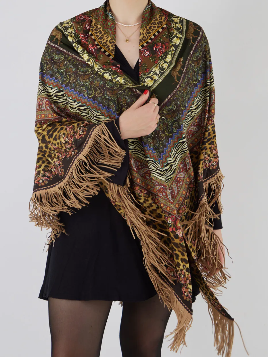 Der Poncho-Schal von Katherina Loretta bringt mit seinem ausdrucksstarken Mix aus Animalprint, floralen Elementen und langen Fransen herbstlichen Boho-Flair in jede Garderobe.