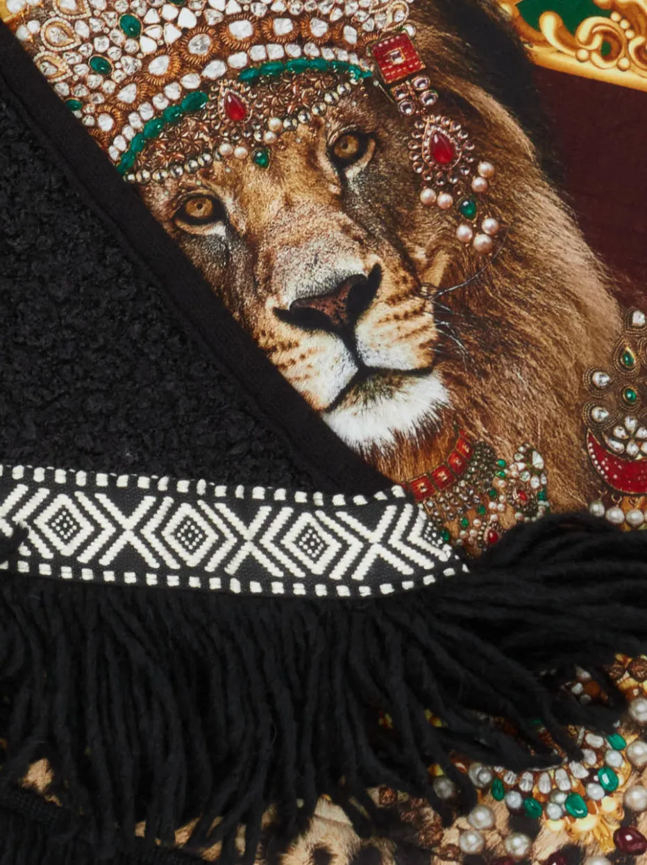 Dieser Poncho verkörpert die Einzigartigkeit und Kreativität des niederländischen Labels Katherina Loretta. Auf schwarzem Grund befinden sich exotische Tiere, die prachtvoll geschmückt und in einem Goldrahmen in Szene gesetzt worden sind. Die schwarzen Wollfransen sowie die kuschelige Innenseite sind winterliche Details und versprechen auch an kalten Tagen wohlige Wärme. Dieses extravagante Accessoire ist ein Must-have für jede Fashionista! – Material: 96% Viskose und 4% Lycra bedruckte Seite, 95% Polyester und 5 % Wolle Rückseite – Maße: ca. 220 x 145 x 145 cm – Pflegehinweise: Handwäsche