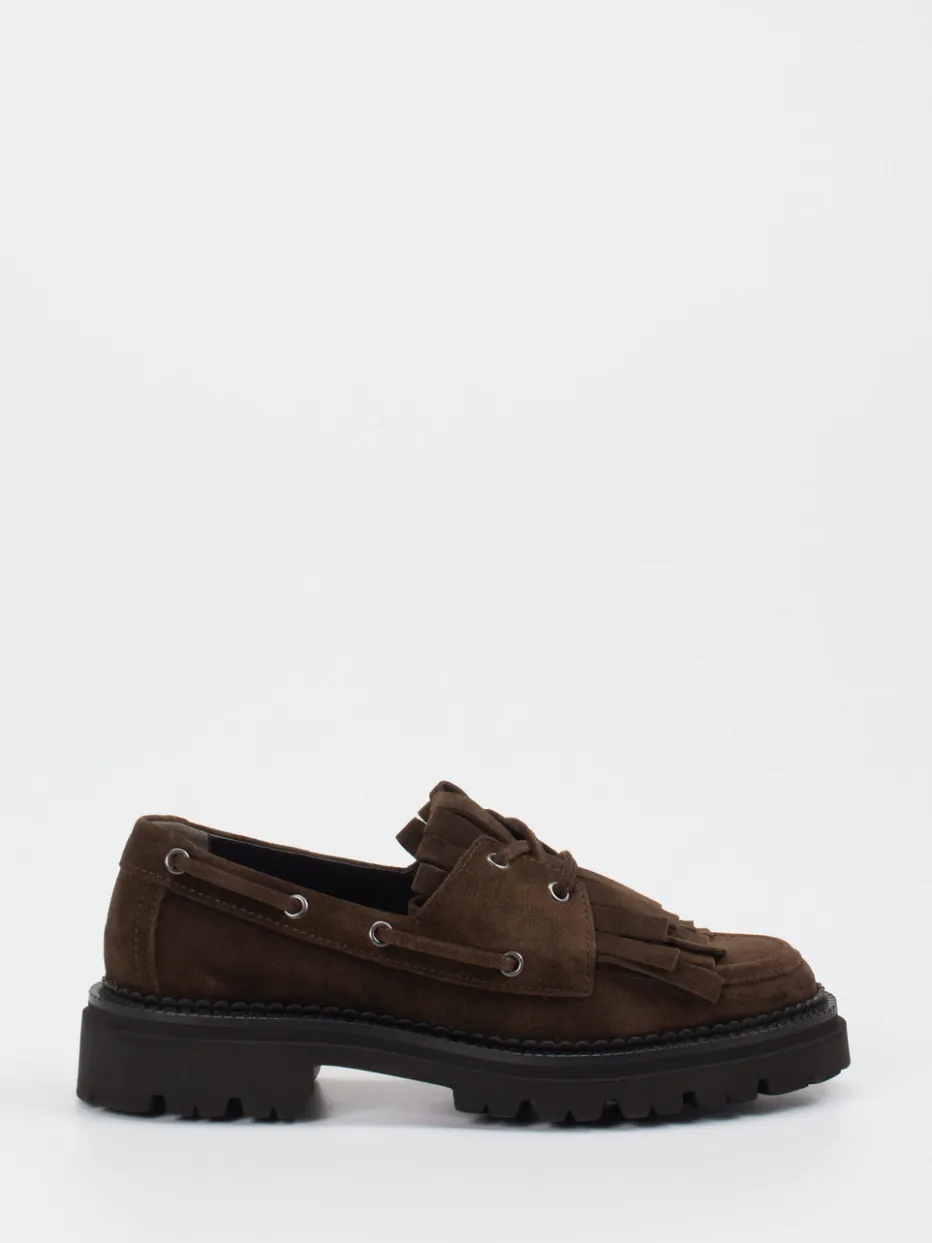Samtiges Veloursleder, eine moderne Fransenlasche und die betont robuste Chunky-Sohle machen diesen Loafer zum stilistisch souveränen Begleiter für urbane Looks.