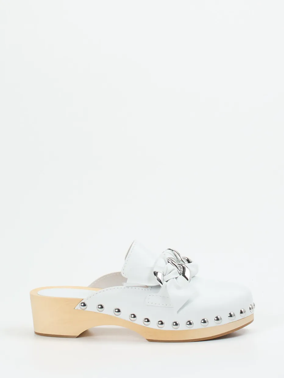 Metallik trifft Naturholz.Die Marke Kennel & Schmenger interpretiert Clogs neu – mit femininer Raffinesse und authentischen Retro-Anklängen. Ideal für entspannte Tage im Sommer, verbinden diese Damen-Clogs offwhitefarbenes Kalbleder mit einer glänzenden Oberfläche und geprägter Kette samt Schleifendetail. Silberfarbene Nieten betonen den Übergang zur natürlichen Holzsohle, die dank profilierter Gummierung komfortabel bleibt. Der offene, leicht trapezförmige Schnitt führt die Vintage-Idee stilsicher weiter und greift aktuelle Metallic-Trends auf. Passt perfekt zu Leinenkleid und Korbtasche. Ein sommerlicher Stilbegleiter mit handwerklicher Note und modischem Understatement.