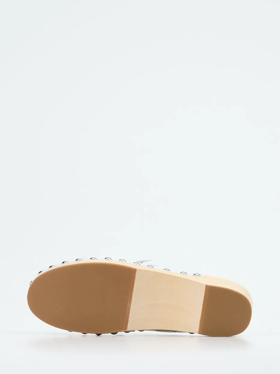 Die Clogs von Kennel & Schmenger setzen mit metallischen Akzenten und hochwertigem Kalbleder stilvolle Retro-Statements. Eine naturbelassene Holzsohle verleiht subtile Eleganz mit Vintage-Flair.