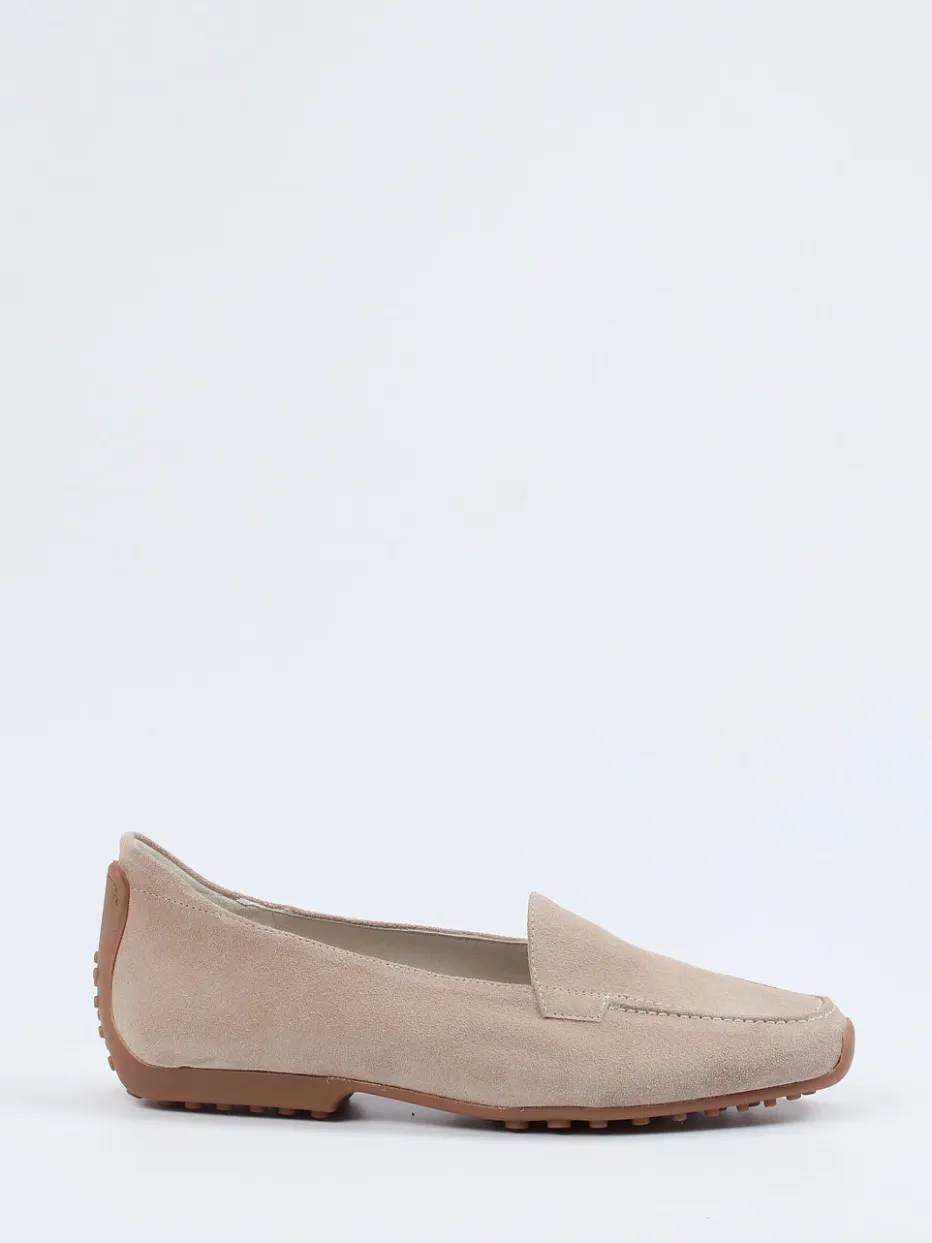 Ein Damen-Loafer mit minimalistischem Anspruch: Gefertigt aus softem Veloursleder in edlem Beigegrau und ausgestattet mit strukturierter Gummisohle für einen alltagstauglich-luxuriösen Auftritt.